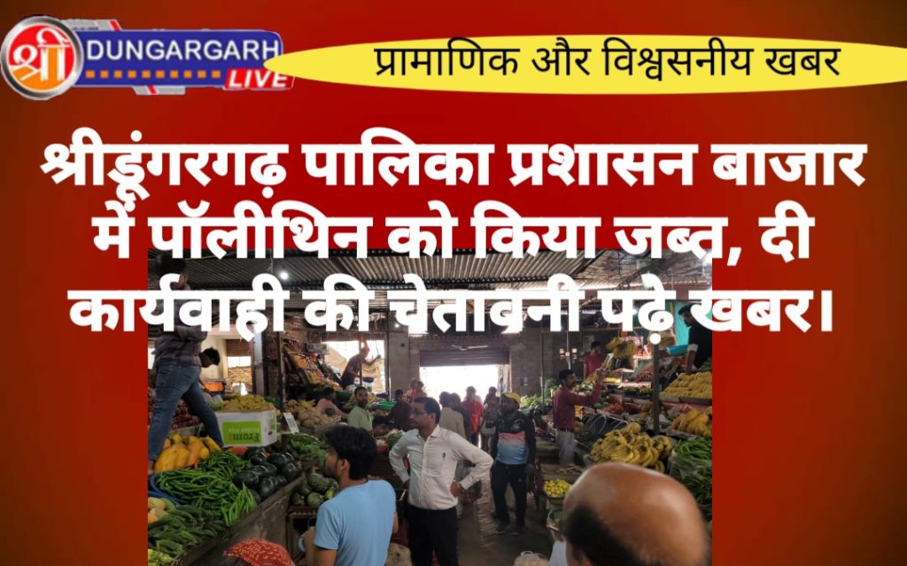 श्रीडूंगरगढ़ पालिका प्रशासन आज सुबह बाजार पहुंचा और सब्जी मंडी में कई दुकानों में पॉलीथिन जब्त की ऐसे में कई शिकायतों, मीडिया में आलेखों, प्रशासनिक अधिकारियों के निर्देशों के बाद आखिरकार मंगलवार को पालिका ईओ शहर में निकले और पॉलीथिन का प्रयोग करने वाले दुकानदारों पर सख्ती दिखाई।