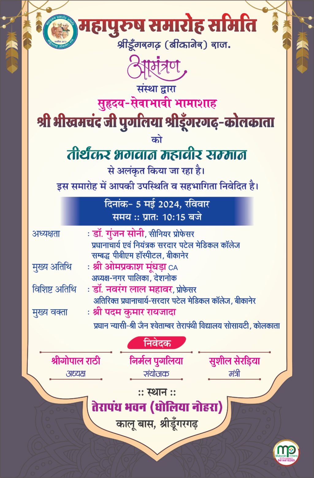 महापुरुष समारोह समिति श्री डूंगरगढ़ द्वारा तीर्थंकर भगवान महावीर सम्मान समारोह 5 मई को तेरापंथ भवन धोलिया नोहरा आयोजित होगा । संस्था अध्यक्ष श्रीगोपाल राठी ने बताया कि भगवान महावीर के विचारों को सार्थक करने एवं समाजहितार्थ कार्यो में अग्रणी भूमिका निभाने वाले व्यक्तित्व श्री भीखमचन्द पुगलिया को सम्मान से अलंकृत किया जाएगा । कार्यक्रम संयोजक निर्मल पुगलिया ने बताया सम्मान समारोह की अध्यक्षता- डॉ गुंजन सोनी प्रधानाचार्य एवं नियंत्रक सरदार पटेल मेडिकल कॉलेज बीकानेर, मुख्यअतिथि देशनोक नगरपालिका अध्यक्ष- ओमप्रकाश मूंधड़ा , विशिष्ट अतिथि- नवरंग लाल महावर प्रोफेसर सरदार पटेल मेडिकल कॉलेज बीकानेर, मुख्यवक्ता- पदम कुमार रायजादा प्रधान न्यासी श्री जैन श्वेताम्बर तेरापंथी विद्यालय सोसायटी कोलकाता होंगे । कार्यक्रम की व्यवस्था को लेकर मंत्री सुशील सेरडिया, तुलसीराम चोरड़िया, विजयराज सेवग, विजय महर्षि, ललित बाहेती, अशोक पारीक, सुरेश भादानी को जिम्मेदारी सौंपी गई है ।