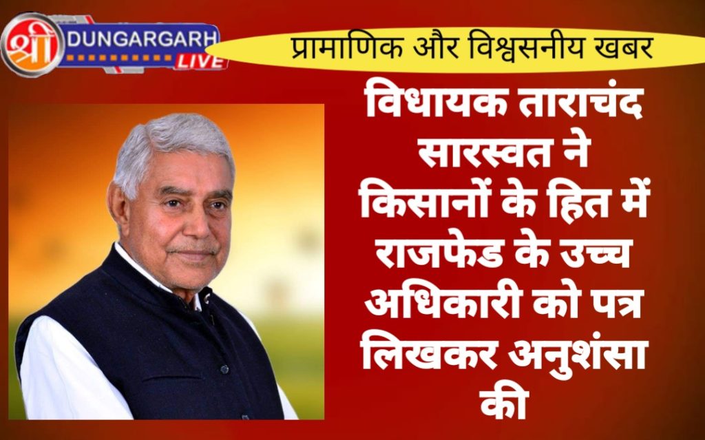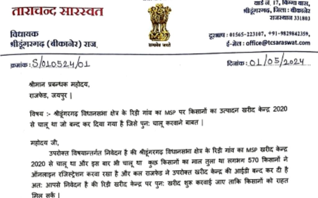 विधायक सेवा केंद्र श्रीडूंगरगढ़ पर विधायक ताराचंद सारस्वत के पास रीडी गांव के किसानों के प्रतिमंडल ने मुलाकात कर रीडी में एमएसपी खरीद केंद्र ऑनलाइन रजिस्ट्रेशन आईडी 2020 से चालू थी और अब इस बार भी चालू थी जिसमें लगभग 570 किसानों का माल ऑनलाइन भी हुआ था लेकिन अब बंद कर दिया है जिसको पुनः चालू करवाने की मांग की। जिस पर विधायक ताराचंद सारस्वत ने तुरंत संज्ञान लेते हुए राजफैड के उच्च अधिकारी से फोन पर वार्ता की ओर पत्र लिखकर रीडी खरीद केंद्र की ऑनलाइन रजिस्ट्रेशन आईडी को पुनः चालू करने का कहा जिससे किसानों को राहत मिल सके। राजफैड के अधिकारियों ने विधायक ताराचंद सारस्वत की अनुशंसा पर इसे जल्द ही शुरू करने की बात कही।