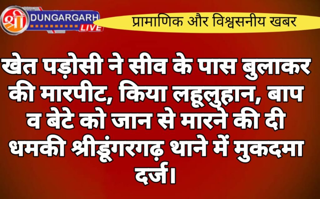 श्रीडूंगरगढ़ थाने में मुकदमा दर्ज करवाते हुए मोहनराम पुत्र आदुराम जाति जाट उम्र 55 साल निवासी गुसाईसर बड़ा ने बताया की मेने कास्त पर खेत ले कर रखा है अभी खेत में सुड़ का काम चल रहा है मेरे खेत पड़ोसी आरोपी अमराराम पुत्र लाधूराम जाति लुहार निवासी गुसाइसर बड़ा ने मेरे खेत में सुड़ करके डाल दिया जिसका मेने ओलमा दिया तब आरोपी ने गाली गलौज किया और कहा के में तो ऐसे ही दूसरे के खेत में कचरा डालता हु । प्रार्थी ने बात को अनदेखा करते हुए वहां से चला गया। शुक्रवार के दिन सुबह 8:30 बजे आरोपी पड़ोसी ने प्रार्थी को अपने खेत की सीव के पास बुलाकर गाली गलौज किया प्रार्थी के दोनों हाथ पकड़ कर तारों से घसीटा। सर पर मुक्के से मारपीट की । पार्थी को लहूलुहान किया तभी प्राथी का लड़का भागकर आया और इनको छुड़वाया।आरोपी ने धमकी की की तेरे खेत का रास्ता मेरे खेत से होकर जाता है तेरे बाप और बेटे को जान से मार दूंगा। श्रीडूंगरगढ़ थाने में आरोपी के खिलाफ मुकदमा दर्ज कर लिया है और आगे की जांच देवाराम को सौंप दी है।