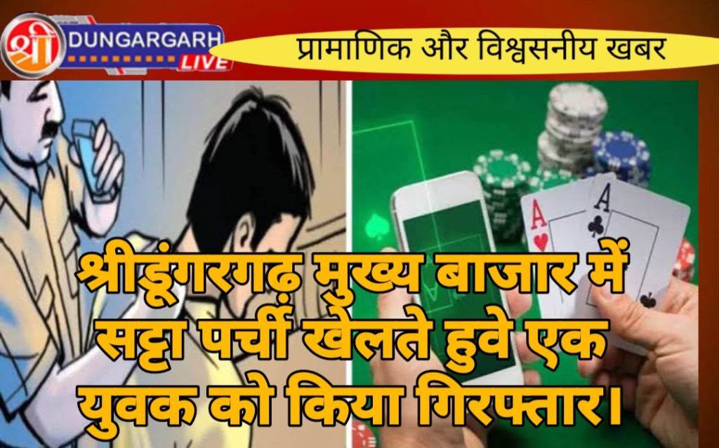 श्रीडूंगरगढ़ बीच बाजार में एसबीआई बैंक के पास है दो युवक सट्टा पर्ची खेल रहे थे पुलिस को मिली जानकारी के अनुसार पुलिस एसबीआई बैंक के पास पहुंची तभी दो युवकों में से एक युवक भीड़ में मौका देकर भाग गया और दूसरे को पुलिस ने गिरफ्तार कर लिया। गिरफ्तार युवक का नाम राकेश सिद्ध पुत्र रामकरण सिद्ध उम्र 33 साल निवासी मोमासर बास है।पुलिस की तलाशी के दौरान सट्टा पर्ची पेन डायरी और 530 रूपये नगद बरामद किए। श्रीडूंगरगढ़ पुलिस ने युवक को गिरफ्तार कर लिया है