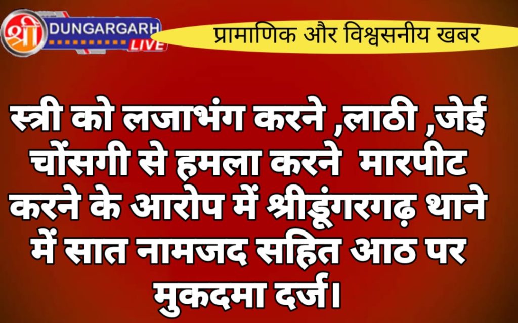 श्रीडूंगरगढ़ थाने में मुकदमा दर्ज करवाते हुए कालूराम पुत्र जेठाराम जाति खाती निवासी ग्राम रीड़ी ने बताया की रात्रि के समय मेरे घर वाले घर की बाखल में और में और मेरी पत्नी छत पर सो रहे थे तभी आरोपी रामप्रताप,मोहनराम, गिरधारी पुत्र दूदाराम,शांतिदेवी पत्नी रामप्रताप, रेवंत राम, प्रभुराम पुत्र रामप्रताप, श्याम सुंदर पुत्र मोहन राम, घनश्याम पुत्र गिधाराम, मुकेश पुत्र मोहन राम ,पार्वती पत्नी मोहन राम, जसोदा पत्नी गिदाराम, राजबाला पत्नी लालचंद जाट निवासी रीड़ी व 5,6अन्य व्यक्तियों के साथ ट्रैक्टर पर सवार होकर हाथ में लाठियां, चोसंगी, जेई लेकर मेरे घर पर नाजायज रूप से आए। प्राथी के साथ मारपीट की बाई आंख, फसलियो और मगरो पर वार किया।जिससे प्राथी घायल हो गया प्रार्थी की पत्नी ने बीच बचाव किया तब पत्नी को पकड़ कर घिसा व कपड़े उतार दिए प्रार्थी को घसीटते हुए जबरदस्ती अपरहण करने की कोशिश की घर में सोए सदस्यों ने बीच बचाव करके प्रार्थी को छुड़ाया। आरोपी प्राथी के पत्नी के गले में सोने के आभूषण छीन कर ले गए। प्राथी के घर पर नाजायज रूप से रात्रि में घुसने ,स्त्री को लगा भंग करने और आभूषण छीनने के मामले में श्रीडूंगरगढ़ पुलिस ने सभी आरोपियों के खिलाफ मुकदमा दर्ज कर लिया है और आगे की जांच एसआई रविंद्र सिंह को सौंप दी है।