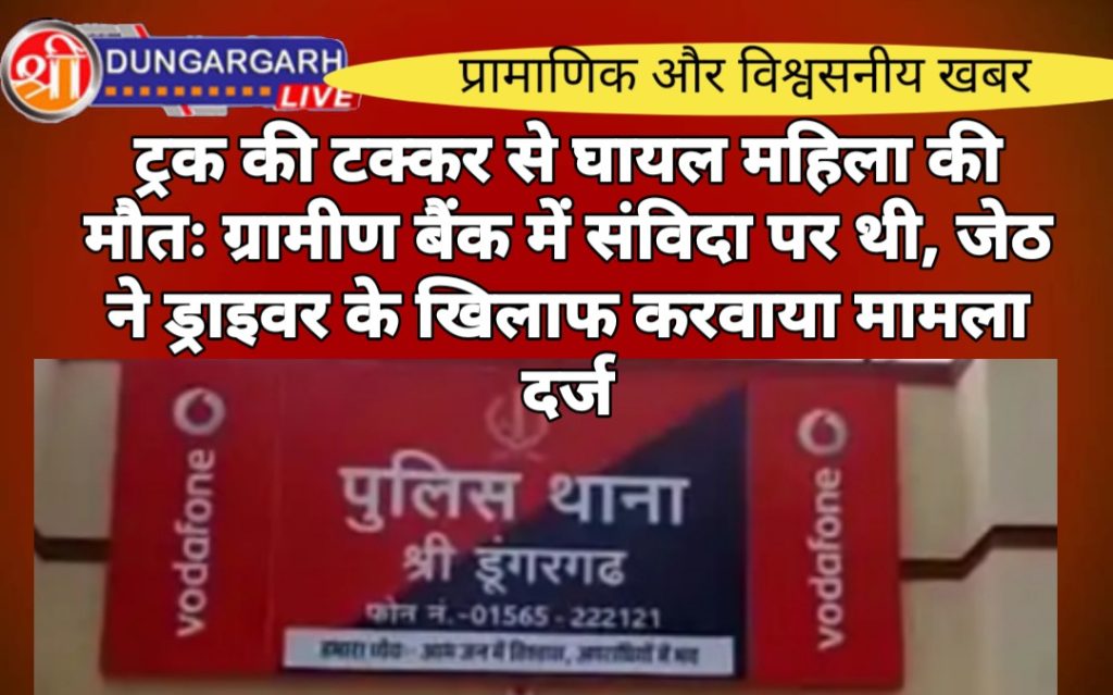 ट्रक की टक्कर से घायल महिला ने हॉस्पिटल में इलाज के दौरान दम तोड़ दिया। अब महिला के जेठ ने ड्राइवर के खिलाफ मामला दर्ज करवाया है। हादसा पीडूंगरगढ़ सर्किल पर हुआ था।मामले के अनुसार श्रीडूंगरगढ़ में घूमचक्कर स्थित बडौदा राजस्थान ग्रामीण बैंक में कार्यरत महिला कार्मिक बुधवार शाम को बैंक में काम खत्म कर घर जा रही थी। वह पैदल ही बीदासर रोड पर लगने वाली बसों की ओर जा रही थी। इस दौरान गोलाई पर एक ट्रक ने उसे कुचल दिया। महिला ने पीबीएम अस्पताल में इलाज के दौरान मौत हो गई।