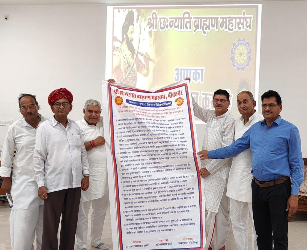 आज श्री डूंगरगढ़ में श्री छःन्याति ब्राह्मण महासंघ का शिष्टमंडल श्रीडूंगरगढ़ विधायक श्री ताराचंद सारस्वत से मिला और उनसे महासंघ कार्यकारिणी द्वारा सर्वसम्मति से अनुमोदित आगामी 20 वर्ष की कार्य योजना के विमोचन का आग्रह किया। श्री ताराचंद सारस्वत ने महासंघ के संकल्प-पत्र अर्थात 20 वर्ष की कार्य योजना के विजन डॉक्यूमेंट का अपने कर कमलों से लोकार्पण किया। इस विजन डॉक्युमेंट में अगले दो वर्ष, 5 वर्ष और 20 वर्ष में किए जाने वाले कार्यों को क्रमबद्ध रूप से अंकित किया गया है। इसमें छात्रसदन एवं अतिथिग्रह का संपूर्ण निर्माण, प्रत्येक तहसील में महासंघ द्वारा संचालित स्कूलों एवं कॉलेजों का निर्माण, संभाग मुख्यालय पर एक इंजीनियरिंग कॉलेज और एक मेडिकल कॉलेज का निर्माण, छःन्याति ब्राह्मण युवाओं के लिए कोचिंग केंद्रों का निर्माण, अंतर्न्यात विवाह समारोह आयोजित करने की कार्य योजना आदि अनेक बिंदु शामिल किए गए हैं जिनसे आने वाले समय में बीकानेर में निर्माणाधीन छात्रसदन एवं अतिथिगृह, शैक्षणिक केंद्र और ऑफिस कंपलेक्स महासंघ के एक शक्ति केंद्र के रूप में बनकर उभरेंगे। श्री ताराचंद सारस्वत ने कहा कि महासंघ का यह संकल्प-पत्र अर्थात विजन-डॉक्युमेंट पूरे प्रदेश के ब्राह्मण संगठनों के लिए एक आदर्श आचार संहिता के रूप में मार्गदर्शन करने वाला दस्तावेज साबित होगा। श्री सारस्वत ने महासंघ को यह विजन डॉक्यूमेंट बनाने और इस संकल्प-पत्र में शामिल सभी संकल्पों को योजनाबद्ध तरीके से पूरा करने के लिए अग्रिम शुभकामनाएं प्रेषित कीं। महासंघ के शिष्टमंडल में संरक्षक भंवरलाल व्यास, अध्यक्ष पाराशर नारायण शर्मा, वरिष्ठ उपाध्यक्ष इंजीनियर मदन सारस्वत, उपाध्यक्ष बलदेव सारस्वत और संगठन महामंत्री सत्यनारायण शर्मा शामिल थे।