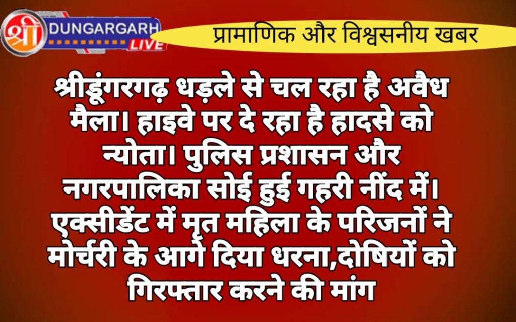 श्रीडूंगरगढ़ में किसी के निजी फायदे के चलते प्रशासन और आयोजक इतने अंधे हो गए कि उनकी अनदेखी के चलते एक हंसता खेलता परिवार उजड़ गया। कस्बे से निकलती स्टेट हाइवे पर के साइड में बने दशहरा मैदान में इन दिनों एक न्यूज पोर्टल के मीडिया पार्टनरशिप में इसी पोर्टल के परिजनों द्वारा मेला लगाया गया है। ज्ञात हो कि कल गुरुवार रात्रि को मेले से निकलते ही एक महिला और उसके दो बच्चो को मोटरसाइकिल ने टक्कर मार दी, जिसमे महिला की मौत हो गई और गंभीर रूप से घायल बच्चो को बीकानेर रेफर कर दिया गया। नगरपालिका अध्यक्ष मानमल शर्मा से बात करने पर पता चला कि नगरपालिका द्वारा किसी भी प्रकार की स्वीकृति नही दी गयी है। दशहरा मैदान की कमेटी बनी हुई है वे ही इसके लिए उत्तरदायी है। उसमें होने वाले आयोजनों के लिये स्वीकृति कमेटी ही जारी करती है।