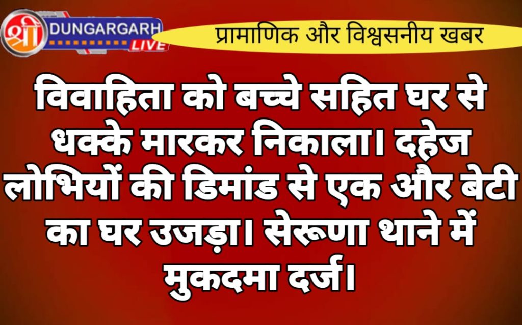 सेरूणा थाने में एक विवाहिता ने मुकदमा दर्ज करवाते हुए बताया कि मेरी शादी आज से करीबन 18 साल पहले कल्यानसर पुराना गांव में हुई थी। पीड़िता का आरोप है की ससुराल में मुझे मानसिक रूप परेशान किया जाता है समय पर खाना नही दिया जाता , ससुराल में आए दिन लड़ाई झगड़ा करते है पति, सास,ससुर, नंनद, बनोई शादी में कम दहेज देने को लेकर परेशान करते है।शादी में मेरे पीहर वालों ने अपनी हैसियत से बढ़-चढ़कर दहेज दिया था। ससुराल में मेरे पति, सास और ससुर,ननद और बहनोई हमेशा कम दहेज देने के लिए मुझे प्रताड़ित करते रहते हैं आरोपी पति ,सास और ससुर ने पीहर से और दहेज लाने को कह रहे है पीड़ित महिला ने कहा की पीहर वाले गरीब है और दहेज नहीं दे सकते हैं। मेरे दो संतान ललिता उम्र 13 साल है और निशा 9 साल है कई बार पीहर वालों ने पच पंचायती की फिर भी आरोपी के व्यवहार में कोई परिवर्तन नहीं हुआ आरोपियों ने पीड़िता गर्भवती भी है और उसके दो पुत्रियों सहित घर से धक्के मार कर निकाल दिया। सेरूणा थाने में आरोपियों के खिलाफ पीड़िता को मानसिक और शारीरिक रूप और दहेज के लिए परेशान करने के लिए थाने में मुकदमा दर्ज कर लिया है आगे की अधिकारी पवन कुमार कर रहे है