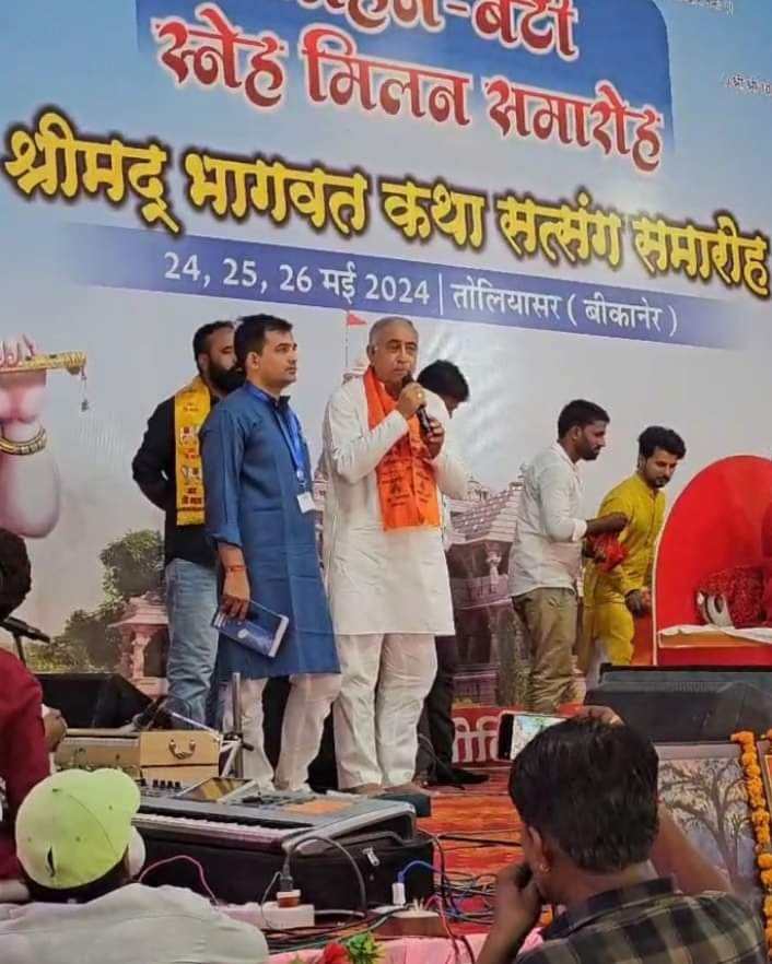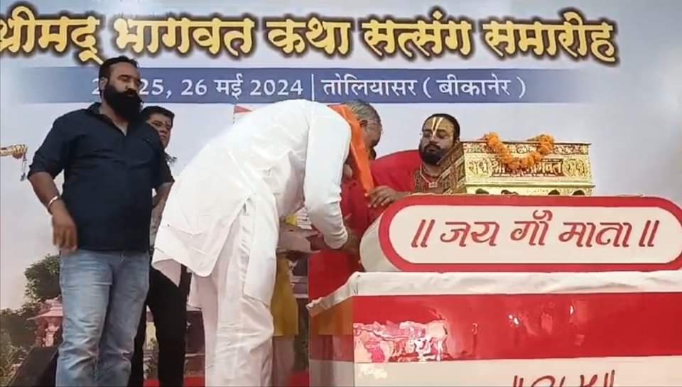 ग्राम तोलियासर में चल रहे बहन बेटी सम्मेलन और भगवत कथा में आज राज्य मंत्री विश्व कर्मा कौशल बोर्ड के अध्यक्ष रामगोपाल सुधार पहुंचे । ग्रामीणों और राजपुरोहित समाज के लोगो ने राज्य मंत्री को डूपटा पहनाकर स्वागत किया। राज्य मंत्री ने भगवत कथा का आनंद लिया और व्यास पीठ पर महाराज मनोहर दास जी से आशीर्वाद लिया ।