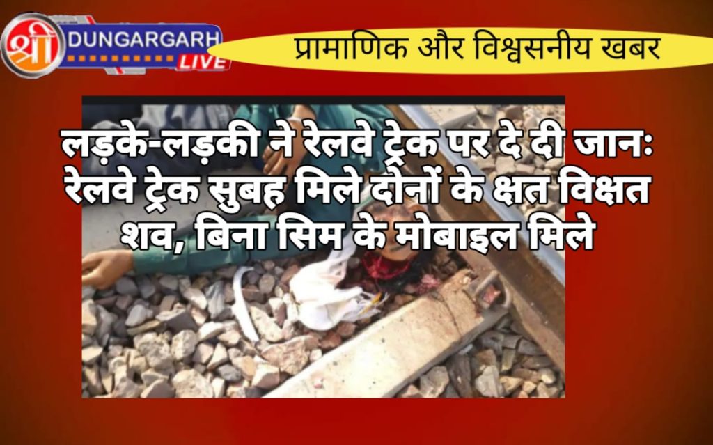 नापासर गांव के पास रेलवे ट्रेक पर एक युवक और युवती ने ट्रेन के आगे कूदकर जान दे दी। दोनों की उम्र करीब बीस से बाईस साल के बीच मानी जा रही है। दोनों दूर के रिश्ते में भाई-बहन बताये जा रहे हैं और जसरासर थाना क्षेत्र के मंसूरी गांव के रहने वाले हैं थानाधिकारी जसवीर ने बताया कि दोनों की शिनाख्त हो गई है। दोनों मंसूरी गांव के रहने वाले मेघवाल परिवार के सदस्य है। दोनों रिश्ते में भाई बहन है। किस तरह भाई बहन है, ये अभी तय नहीं हुआ है। दोनों के नाम अब तक स्पष्ट नहीं हुए हैं। बुधवार को सुबह करीब छह बजे दिल्ली से बीकानेर आने वाली ट्रेन के आगे इन दोनों युवकों ने एक साथ कूदकर अपनी जान दी है। दोनों के शव आसपास ही मिले हैं और दोनों के शरीर के अधिकांश हिस्से क्षत विक्षत हो गए हैं। पुलिस ने सोशल मीडिया पर दोनों के फोटो अपलोड किए तो पता चला कि ये दोनों जसरासर थाना क्षेत्र के मंसूरी गांव के रहने वाले हैं। दोनों के परिजनों को सूचना दी गई है, जो मौके पर पहुंच रहे हैं।