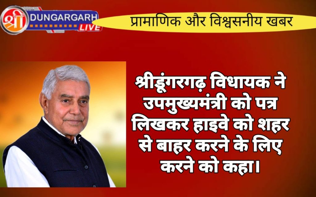 विधायक ताराचंद सारस्वत ने उपमुख्यमंत्री एवं सार्वजनिक निर्माण विभाग मंत्री दिया कुमारी को पत्र लिखा है। विधायक ने पत्र में बताया है कि नेशनल हाइवे नंबर 11 जो जयपुर से बीकानेर आता हैं वो श्रीडूंगरगढ़ के घुमचक्कर होकर गुजरता हैं अनाज मंडी व रेलवे स्टेशन पास में होने के कारण व समय अंतराल के साथ ही श्रीडूंगरगढ़ नगर पालिका की आबादी बहुत ज्यादा बढ़ चुकी है जो कि वर्तमान में 75 हजार से अधिक हैं श्रीडूंगरगढ़ का घूमचक्कर घनी आबादी में आ गया है जिससे घुमचक्कर व उसके आस पास हमेशा जाम लगा रहता है और आए दिन हादसे होते रहते हैं। श्रीडूंगरगढ़ नगर पालिका आबादी क्षेत्र से नेशनल हाइवे 11 बाईपास करके निकाला जाये ताकि कस्बे को जाम व आये दिन हो रहे हादसों से निजात मिल सकें।