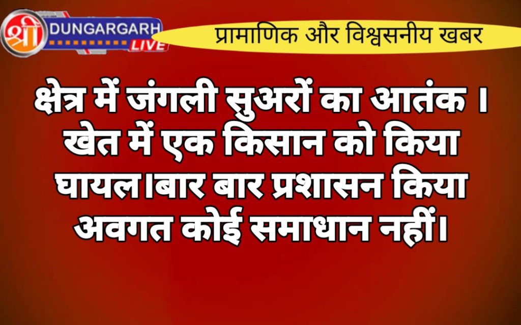 क्षेत्र में जंगली सुअरों का आतंक लगातार बढ़ता जा रहा है ग्रामीण इलाकों में खेतों में काम करने वाले किसान इसका पूरी तरह से शिकार हो रहे हैं। ऐसा ही मामला आज श्री डूंगरगढ़ के बरजांगसर गांव से सामने आया है जहां खेत में काम कर रहे किसान पर जंगली सूअर ने हमला कर दिया और बुरी तरह से काट लिया परिजन उसको अस्पताल लेकर पहुंचे हैं जहां उनका उपचार किया जा रहा है। ग्रामीणों का आरोप है कि प्रशासन को बार-बार शिकायत करने के बाद भी अभी तक किसी भी तरह से कोई समाधान नहीं हो रहा है। आज किसान रामेश्वरलाल पर खेत में काम करते समय सुअरो ने हमला कर दिया जिनका उप जिला अस्पताल में इलाज चल रहा है।