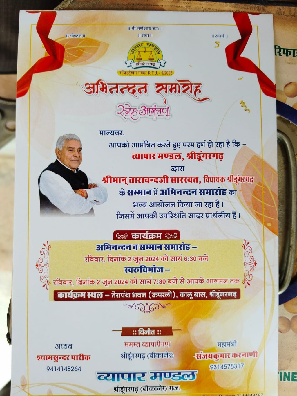 श्रीडूंगरगढ़ विधायक ताराचंद सारस्वत का व्यापार मंडल एक कार्यक्रम आयोजित कर सम्मान करेंगे। व्यापार मंडल के अध्यक्ष श्याम सुंदर पारीक ने जानकारी देते हुए बताया कि 2 जून रविवार को शाम 6:30 बजे तेरापंथ भवन उपरलो में एक भव्य सम्मान अभिनंदन समारोह आयोजित किया जाएगा जिसमें विधायक ताराचंद सारस्वत का भव्य स्वागत व सम्मान किया जाएगा। स्वागत समारोह के पश्चात रात्रि 7.30 बजे से स्वरूचिभोज का कार्यक्रम रखा गया है। पारीक ने बताया कि अभिनंदन समारोह में व्यापारियों के साथ- साथ, राजनेताओं, सामाजिक कार्यकर्ता, सरकारी अधिकारियों, मीडिया के बन्धुओं व शहर के गणमान्य लोगों को भी निमंत्रण भेजा गया है। व्यापार मंडल के महामंत्री संजय कुमार करनाणी ने बताया कि अभिनंदन समारोह को भव्य बनाने के लिए व्यापार मंडल की टीम जुटी हुई है। समारोह की व्यवस्था की जिम्मेदारी व्यापार शुशील कुमार डागा, पवन कुमार राठी, सम्पत बहारी राठी, चैनरुप डागा, फूसराज पुगलिया, हंसराज माली, गोपाल तापड़िया आदि व्यापारियों को सौंपी गई है।