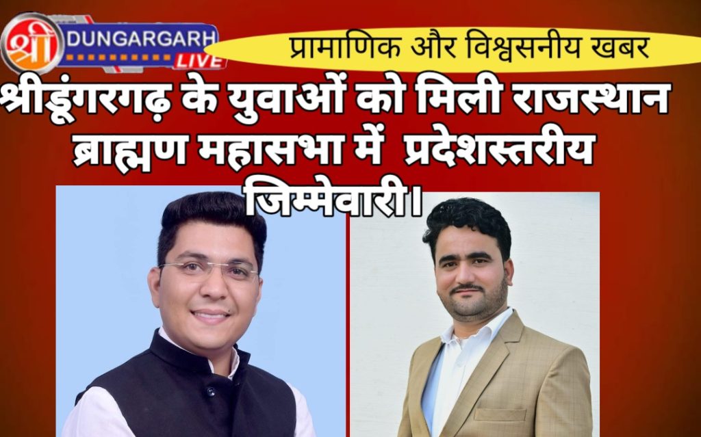 श्रीडूंगरगढ़ के युवा चेहरे जिनको राजस्थान ब्राह्मण महासभा में प्रदेश स्तर की जिम्मेदारी मिली है। सुनील तावनिया को युवा परकोष्ठ में प्रदेश उपाध्यक्ष और व्यवसायी एवं सामाजिक कार्यकर्ता आईदान पारीक को राजस्थान ब्राह्मण महासभा युवा प्रकोष्ठ की प्रदेश कार्यकारिणी में शामिल किया गया है। महासभा के युवा प्रकोष्ठ के प्रदेशाध्यक्ष एडवोकेट रामानुज शर्मा ने जानकारी देते हुए बताया कि श्रीडूंगरगढ़ कस्बे के युवा व्यवसायी और सामाजिक कार्यकर्ता सुनील तावनीया और आईदान पारीक को समाज के प्रति उनकी निष्ठा और सेवा भाव को देखते हुए प्रदेश कार्यकारिणी में जगह दी है। बता देवे की आईदान पारीक श्री छः न्याति ब्राह्मण संघ के भी तहसील अध्यक्ष है। और सुनील तावणीया श्रीडूंगरगढ़ से जनसेवक है दोनो को प्रदेश कार्यकारिणी में पधाधिकारी बनाये जाने पर क्षेत्र के युवाओं ने बधाई दी और प्रदेश कार्यकारिणी का आभार जताया।