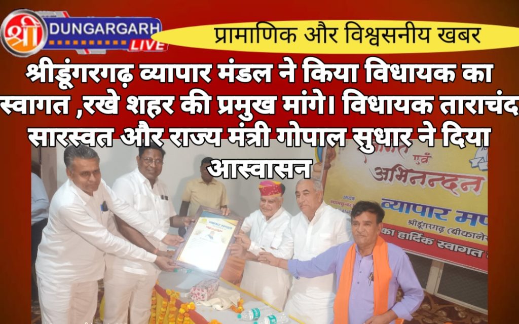 मंच से व्यापार मंडल के अध्यक्ष श्यामसुंदर पारीक, मंत्री संजय करनाणी ने श्रीडूंगरगढ़ विधायक, राज्यमंत्री और नगरपालिका अध्यक्ष मानमल शर्मा का माला, साफा, शॉल और सम्मान पत्र देकर नागरिक अभिनंदन किया। क्षेत्र के व्यापारियों ने विधायक सारस्वत, राज्यमंत्री सुथार और नगरपालिका अध्यक्ष शर्मा का माला पहनाकर स्वागत-अभिनंदन किया।