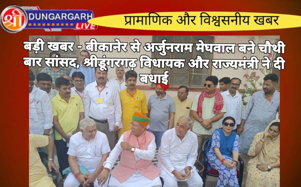 बीकानेर में लगातार चौथी बार सांसद अर्जुनराम मेघवाल की विजय होने पर भारतीय जनता पार्टी कार्यालय श्रीडूंगरगढ़ में भाजपा कार्यकर्ताओं ने जश्न मनाया ।वही श्रीडूंगरगढ़ विधायक ताराचंद सारस्वत , राज्य मंत्री रामगोपाल सुथर ने अर्जुन राम मेघवाल से मिलकर जीत की बधाई दी। इस दौरान विधायक ताराचंद सारस्वत, राज्य मंत्री रामगोपाल सुथार,विधायक सिद्धी कुमारी,विधायक सुमित गोदारा, शिव स्वामी, शिव तावनिया, कोडाराम भादू,रजनी कांत सारस्वत सहित श्री डूंगरगढ़ अनेक कार्यकर्ता मौजूद रहे।
