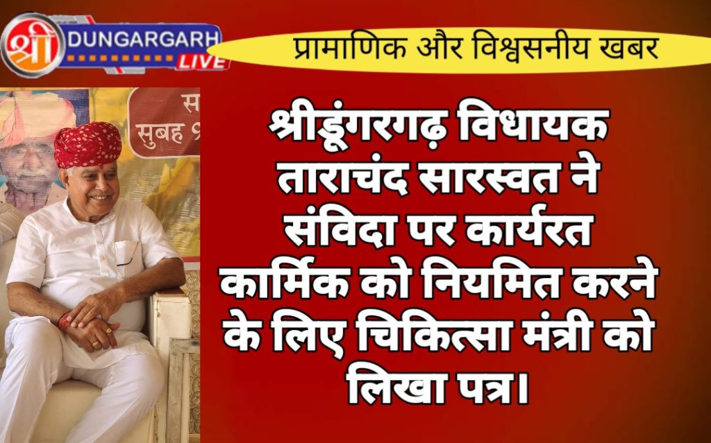 श्रीडूंगरगढ़।एनएचएम योजना के अंतर्गत कार्यरत लेखासहायक,डाटा एंट्री ऑपरेटर ,सेक्टर हेल्थ सुपरवाइजर खण्ड कार्यक्रम अधिकारी ब्लॉक हेल्थ सुपरवाइजर इत्यादि कई पदों पर संविदा कर्मी पिछले 15 वर्षों से भी अधिक समय से सेवा दे रहे है उन संविदाकर्मियों को राजस्थान CONTRACTUAL HIRING TO CIVIL ROOLS 2022 के अंतर्गत स्क्रीनिंग करवाकर नियमित करवाने हेतु श्री डूंगरगढ़ विधायक ताराचंद सारस्वत ने चिकित्सा मंत्री को पत्र लिखकर निवेदन किया है ।
