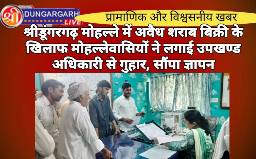 कस्बे के कालूबास के वार्ड 01 के निवासियों ने आज श्रीडूंगरगढ़ उपखण्ड अधिकारी को मोहल्ले में अवैध शराब बिक्री पर रोक लगाने का ज्ञापन देते हुए कहा कि मोहल्ले में अवैध शराब की ब्रांच से नाजायज रूप से 24 घण्टे बिक्री की जा रही है। जिसके कारण मोहल्ले की उस गली में आवागमन करती महिलाओं और बच्चियों को शर्मनाक हरकतों से रूबरू होना पड़ता है। उस अवैध शराब की ब्रांच पर शराबियों का जमावड़ा लगा रहता है जिससे आम राहगीरों को भी परेशानी का सामना करना पड़ता है। मोहल्लेवासियों ने उपखण्ड अधिकारी श्रीमती उमा मित्तल को बताया कि लूणकरणसर जाने वाली सड़क पर स्थित मनोज माहिया व श्यामसुंदर ब्राह्मण की दुकानों पर पुन्नीराम पुत्र चोखाराम और मुकेश कुमार पुत्र आसुराम ने अवैध शराब बेचने की ब्रांच खोल रखी है। इन अवैध शराब माफियाओं और दोनों दुकान मालिको को मोहल्लेवासियों ने समझाया परन्तु उन लोगो ने इन लोगो को ही धमकियां देनी शुरू कर दी। मोहल्लेवासियों का कहना है कि बिना किसी लाइसेंस और परमिट के ही ये शराब माफिया मोहल्ले में अवैध शराब बेचकर मोहल्ले की शांति व्यवस्था भंग कर रहे है। प्रशासन द्वारा इन पर कठोर कार्यवाही की जाकर उस अवेध शराब की दुकानों को बन्द किया जाना चाहिए। इस दौरान मोहल्ले के रामलाल, अशोक, बजरंग, जगदीश, मुखराम गोदारा, सुखनाथ, सुशील, रामप्रताप, रामचन्द्र, हनुमान सहित अनेक मोहल्लेवासी मौजूद रहे।