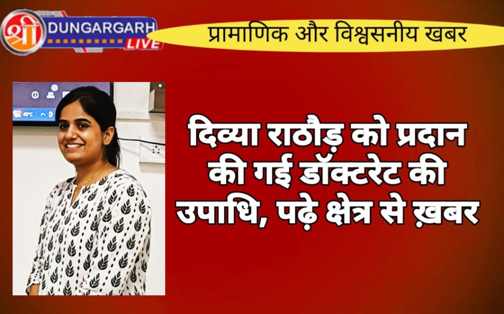 भारतीय सेना के अधिकारी मेजर मोनू सिंह शेखावत की पत्नी दिव्या राठौड़ शेखावत को डॉक्टरेट की उपाधि प्रदान की गई है। डॉ. दिव्या राठौड़ शेखावत ने बिट्स पिलानी से पीएचडी की है। दिव्या ने “नैनो टेक्नो केमिस्ट्री एंड इलेक्ट्रो कैटेलिसिस” विषय में अपना शोध प्रो. सुरजीत पाण्डे के निर्देशन में पूरा किया। गौरतलब है कि डॉ. दिव्या राजस्थान विश्वविद्यालय से बीएससी में गोल्ड मेडलिस्ट रह चुकी है। डॉ. दिव्या ने अपनी इस उपलब्धि का श्रेय गुरुजनों सहित अपने पति मेजर मोनूसिंह शेखावत, पिता लादूसिंह धूड़ीला को दिया है।