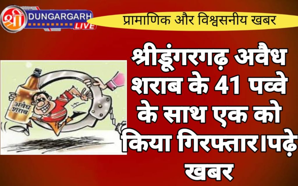 श्रीडूंगरगढ़ पुलिस गस्त के दौरान झवर बस स्टेंड इंडियन पेट्रोल पंप के पास एक व्यक्ति पीले रंग का कटा लिए हुवे खड़ा था पुलिस को देखकर घबरा गया था पुलिस ने व्यक्ति को गिरफ्तार करके नाम पूछा तो उसने अपना नाम शुशील कुमार पुत्र मोहनराम वाल्मीकि उम्र 38साल निवासी कालू बास बताया पुलिस ने कट्टे में चेकिंग दौरान देशी शराब के 41 पव्वे मिले । अवैध रूप से शराब ले जाने के कारण पुलिस ने युवक को गिरफ्तार कर लिया और आगे की जांच भगवानराम को शोप दि।