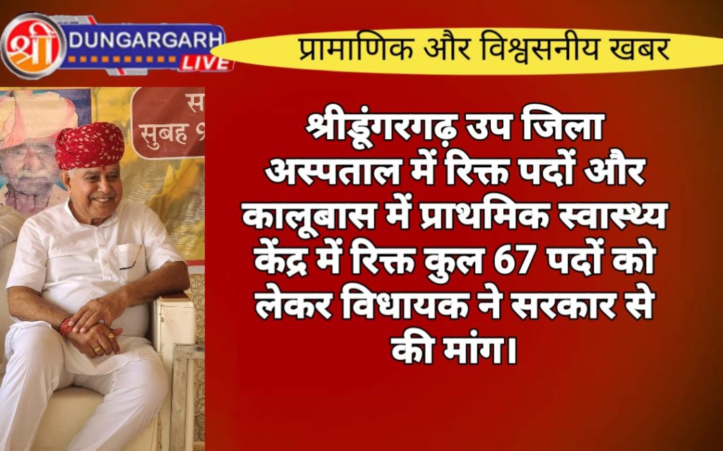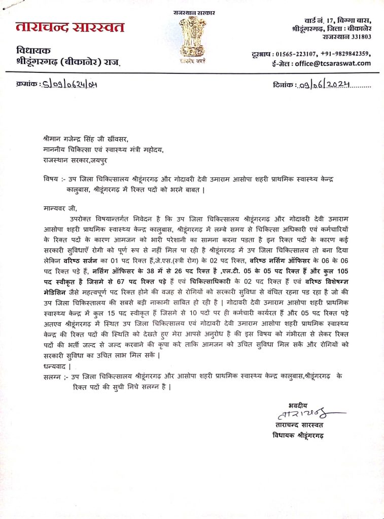 क्षेत्रीय विधायक ताराचंद सारस्वत क्षेत्र के विकास के लिए हर संभव प्रयास कर रहे इसी कड़ी में आज विधायक सारस्वत ने क्षेत्र की सबसे बड़ी अस्पताल उपजिला अस्पताल श्रीडूंगरगढ़ में रिक्त पड़े पदों को जल्द से जल्द भरने के लिए चिकित्सा मंत्री गजेंद्र सिंह खींवसर को पत्र लिखा। विधायक ने बताया अस्पताल में लंबे समय से चिकित्सा अधिकारी एवं कर्मचारीओ के रिक्त पदों के कारण आमजन को भारी परेशान आई का सामना करना पड़ रहा है एनरिक पदों के कारण कई सरकारी सुविधा रोगी को पूर्ण रूप से नहीं मिल पा रही है श्रीडूंगरगढ़ में उप जिला चिकित्सालय बना दिया लेकिन वरिष्ठ सर्जन का पद रिक्त है और जे. एस स्त्री रोग के दो पद रिक्त है वरिष्ठ नर्सिंग ऑफिसर के छह के छह पद रिक्त पड़े हैं तथा नर्सिंग ऑफिसर के 38 में से 26 पद रिक्त है साथ ही एलटी के पांच के पांच पद रिक्त पड़े हैं, जिला अप चिकित्सालय श्रीडूंगरगढ़ में 105 पद स्वीकृत है जिसमें से 67 पद रिक्त पड़े एवं चिकित्सा अधिकारी के दो पद रिक्त है साथ ही वरिष्ठ विशेषज्ञ मेडिसिन जैसे महत्वपूर्ण पद भी रिक्त पड़े जिसकी वजह से रोगियों को सरकारी सुविधाओं से वंचित रहना पड़ रहा है इसलिए विधायक ताराचंद सारस्वत ने चिकित्सा मंत्री को चिकित्सालय में रिक्त पड़े पदों को भरने तथा डॉक्टर और नर्सिंग कर्मियों को लगाने हेतु पत्र लिखकर अनुशंसा की ताकि क्षेत्र में चिकित्सा एवं स्वास्थ्य सेवाओं में सुधार हो सके और क्षेत्र वासियों को इसका लाभ मिलेगा। विधायक ताराचंद सारस्वत क्षेत्र वासियों के मूलभूत सुविधाओं के लिए लगातार प्रयास कर रहे हैं।