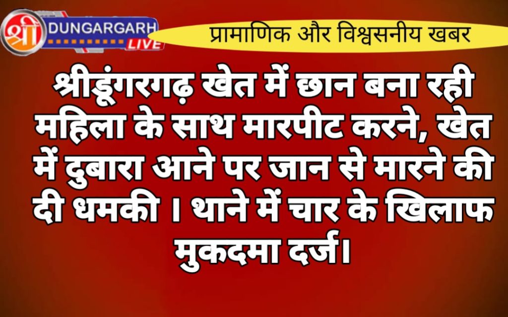 श्रीडूंगरगढ़ थाने में मुकदमा दर्ज करवाते हुए पूना देवी पत्नी टिकुराम जाति नायक उम्र 50 साल निवासी बरजागसर ने बताया कि मेरे पति के पैतृक खेत में,में और मेरी बेटी हीरा और साथ में मेरा दोहिता हम लोग खेत में छपरा बना रहे थे तभी आरोपी बेगाराम पुत्र दीपाराम, ओमाराम पुत्र बेगाराम, चतराराम पुत्र दीपाराम, सोना देवी पत्नी बेगाराम जाति नायक निवासी बरजागसर आए और मेरे साथ मारपीट की, थाप,मुक्को से घायल किया, गाली गलौज दिए। मौके पर आए पड़ोसियों ने बीच बचाव करके प्रार्थी की जान बचाई, पीड़ित महिला ने बताया कि आरोपी खूंखार और बदमाश प्रकृति के हैं महिला को धमकी दिया कि आइंदा इस खेत में आई तो तुम्हें जान से मार देंगे आरोपी खेत हड़पना चाहते हैं श्रीडूंगरगढ़ थाने में सभी आरोपियों के खिलाफ मुकदमा दर्ज कर लिया है और आगे की जांच एसआई धर्मपाल वर्मा को सौंप दिए।