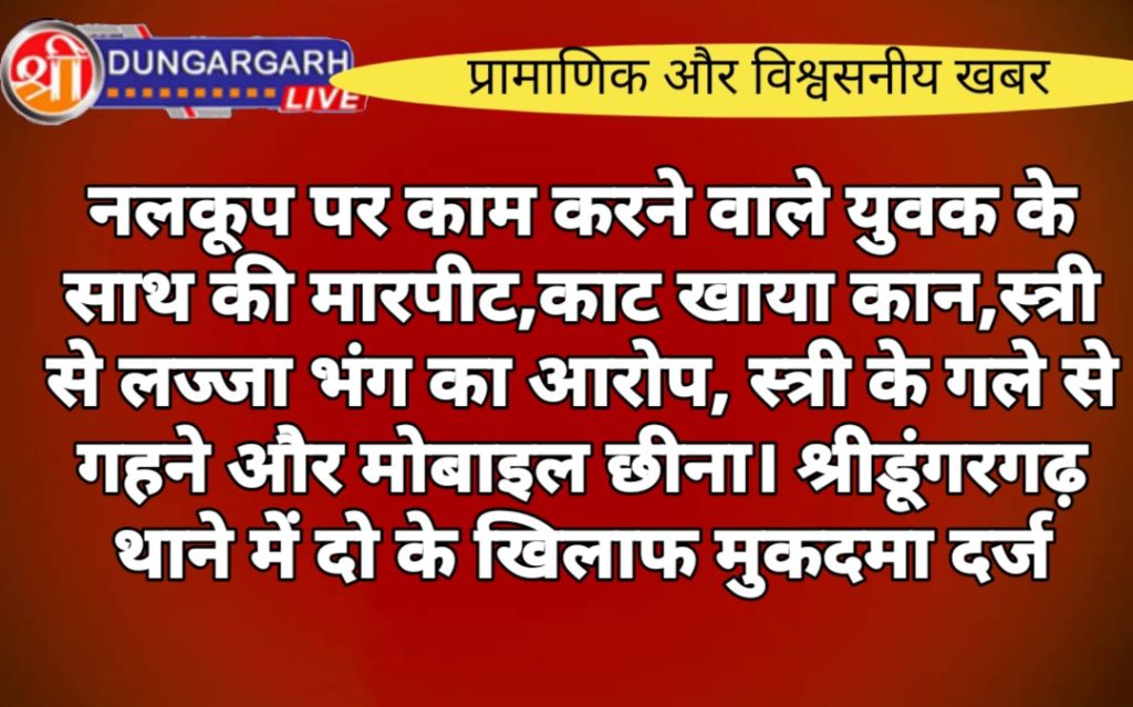 श्रीडूंगरगढ़ थाने में मुकदमा दर्ज करवाते हुए मोमासार निवासी नोरंगलाल जाट ने बताया की में गांव के मुन्नीराम पुत्र हड़मानराम के नलकूप पर काम करता हु आरोपी इसी कारण में से जलन रखते है। प्राथी ने बताया की सोमवार सुबह 9 बजे नोरंगलाल अपने खेत से गांव आ रहा था। रास्ते में आरोपी मिले व उस पर लाठी से वार किया। वह बच गया तो आरोपी रामूराम ने उसका कान अपने दांतों से काट लिया। कान पर दांतो से काटने से कान का आधा हिस्सा कट कर पूरी तरह से अलग हो गया। नोरंगलाल दर्द से चिल्लाया तो बीच बचाव करने उसकी भाभी मौके पर पहुंची। तो आरोपियों ने उसके भी कपड़े फाड़ दिये व लज्जा भंग करते हुए उसके साथ भी मारपीट की। आरोपियों ने उसकी भाभी के गले मे पहने सोने के गहने भी छीन लिए व आइंदा मौका मिलते ही उठा ले जाने, जान से मारने की धमकी दी। पुलिस ने मामला दर्ज कर लिया है व जांच एसआई रविंद्र सिंह कर रहे है।