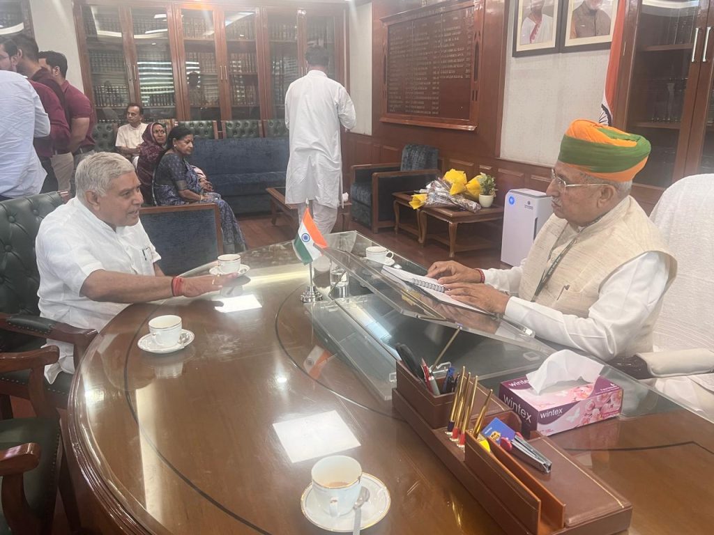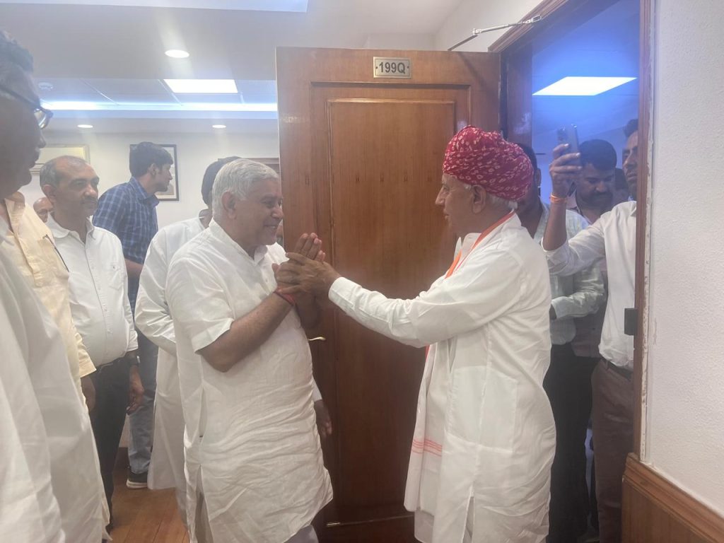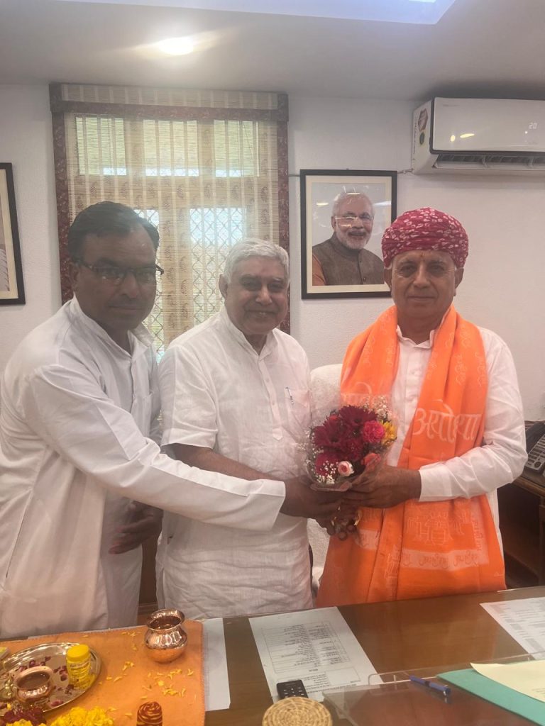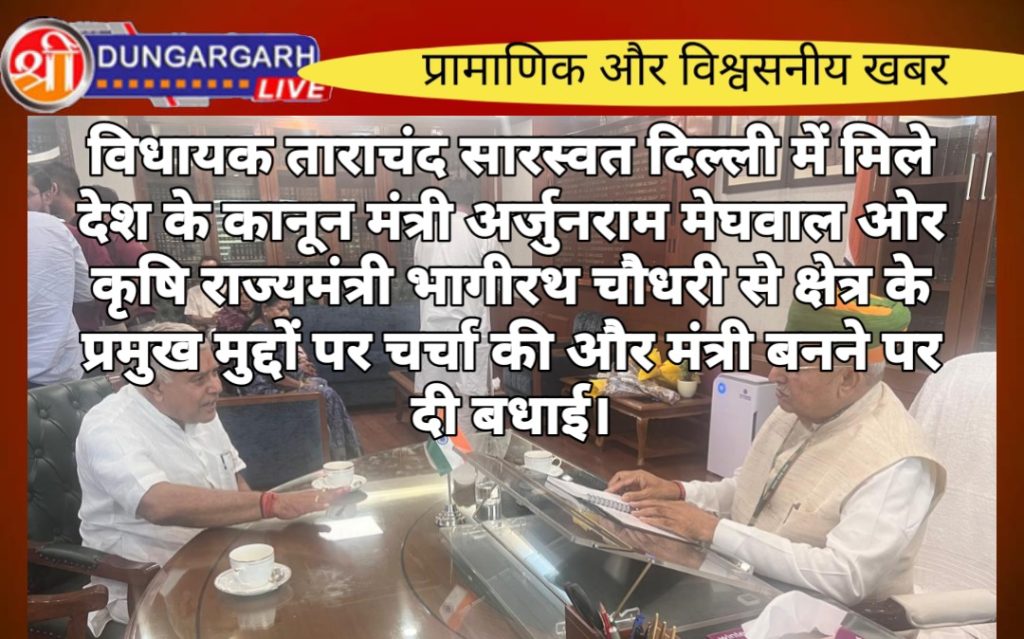 आज विधायक ताराचंद सारस्वत दिल्ली पहुंचकर बीकानेर के लोकप्रिय सांसद अर्जुनराम मेघवाल को मोदी सरकार पुनः केन्द्रीय कानून मंत्री एवं संसदीय कार्य राज्यमंत्री ओर अजमेर सांसद एवं भाजपा किसान मोर्चा के प्रदेशाध्यक्ष भागीरथ चौधरी को कृषि राज्य मंत्री बनने पर आत्मीय बधाई एवं शुभकामनाएं प्रेषित की। विधायक ताराचंद सारस्वत ने बताया कि अर्जुन राम मेघवाल के पुनः कानून मंत्री बनना बीकानेर सहित पूरे राजस्थान के लिए गौरव का विषय हैं। इस दौरान अजमेर सांसद भागीरथ चौधरी को मुंह मीठा करवाकर बधाई प्रेषित की। इस दौरान दोनों मंत्रियों से क्षेत्र के प्रमुख मुद्दों पर चर्चा की। राजस्थान से चार मंत्री बनाने पर विधायक ताराचंद सारस्वत ने प्रधानमंत्री नरेन्द्र मोदी एवँ शीर्ष नेतृत्व के आभार व्यक्त किया।