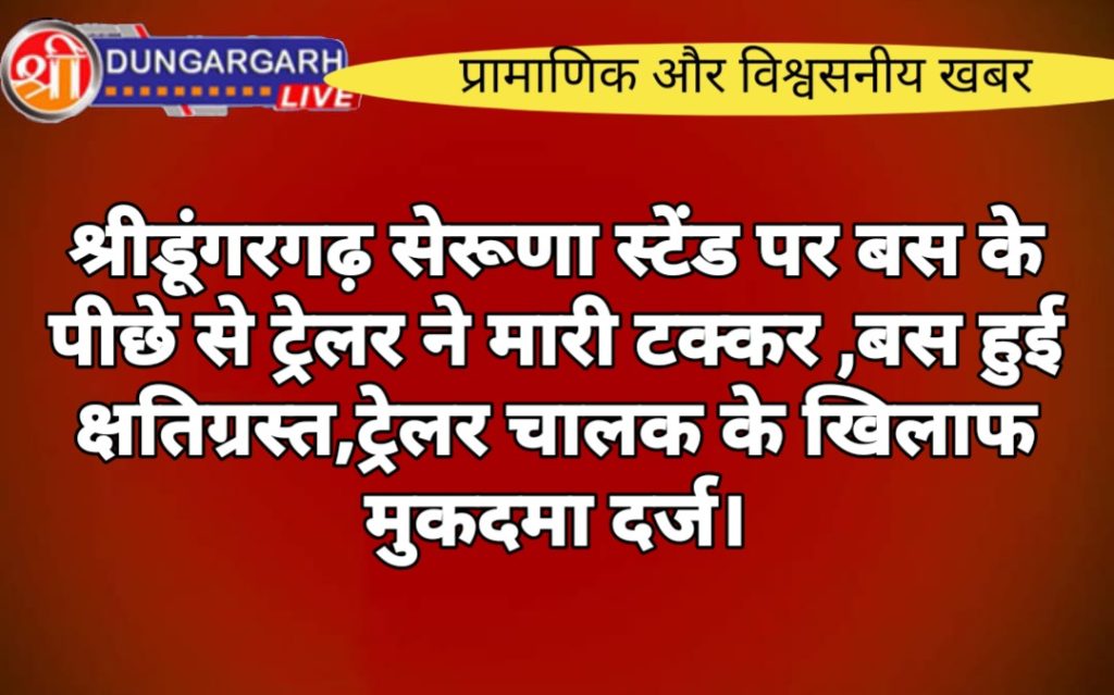 सेरूणा थाने में मुकदमा दर्ज करवाते हुए बजरंग लाल पुत्र चुनाराम जाति जाट उम्र 38 साल निवासी बाना ने बताया कि मेरी बस बीकानेर से भादरा आरजे 49 PA0338 जो की सेरूणा स्टेंड पर सवारिया उतार और चढ़ा रही थी तभी बिकानेर की तरफ से एक ट्रेलर HR 45 D2362 ने बस के पीछे से टक्कर मार दी जिससे बस पीछे से क्षतिगर्स्त हुई है सवारियों को कोई चोट नहीं पहुंची और ट्रेलर चालक तुरंत वहा से श्रीडूंगरगढ़ की तरफ निकल गया । बस चालक ने मुझे फोन किया और मैं श्रीडूंगरगढ़ से सेरूणा की तरफ आया तभी ट्रेलर लखासर में खिलेरी होटल पर खड़ा था मैंने ट्रक चालक का नाम पूछा तो बताया की कैलाशचंद पुत्र कुम्भाराम बावरी निवासी बीदासर बताया ,चालक ने शराब पी रखी थी। बस मालिक ने ट्रेलर चालक के खिलाफ सेरूणा थाने में मुकदमा दर्ज करवाया है आगे की जांच महेश कुमार को शॉप दी है