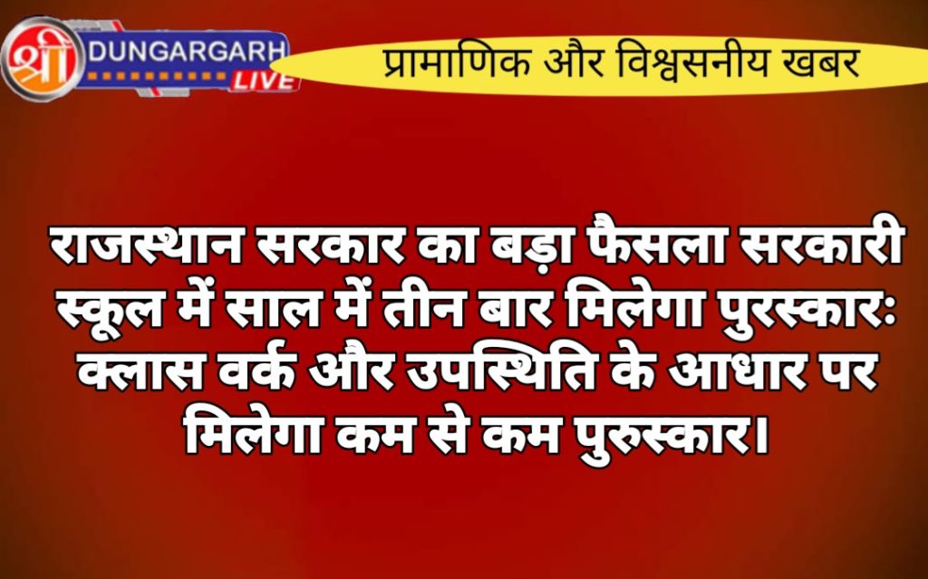 राज्य की भजनलाल सरकार ने सरकारी स्कूलों में स्टूडेंट्स की रेगुलर अटेंडेंस और क्लास वर्क कंपलीट होने पर कम से कम बीस रुपए का पुरस्कार देने का निर्णय किया है। ये पुरस्कार एक बार नहीं बल्कि साल में तीन बार जीतने का अवसर मिलेगा। इस पुरस्कार की राशि कम है लेकिन प्रोत्साहित करने के लिए उसे साल में तीन बार ये पुरस्कार जीतने का अवसर मिलेगा। राजस्थान स्कूल शिक्षा परिषद् ने इस संबंध में आदेश जारी किए हैं।परिषद् की ओर से जारी एक आदेश में कहा गया है कि साल के तीन महीनों अगस्त, अक्टूबर और दिसम्बर में अमावस्या के दिन स्टूडेंट्स को उपस्थिति और क्लास वर्क कंपलीट होने के आधार पर पुरस्कार दिया जाएगा। इसे समुदाय जागृति दिवस कार्यक्रम कहा जाएगा। राज्य के सभी प्राइमरी, अपर प्राइमरी व सीनियर सेकेंडरी स्कूल में विद्यालय विकास समिति की ओर से ये आयोजन किया जाएगा। इस समिति में स्कूल टीचर्स के साथ ही स्टूडेंट्स के पेरेंट्स भी हिस्सा होते हैं। हर स्कूल में पांच-पांच स्टूडेंट्स को ये पुरस्कार दिया जाएगा। इसका चयन समिति सदस्यों से चर्चा के आधार पर किया जाएगा।