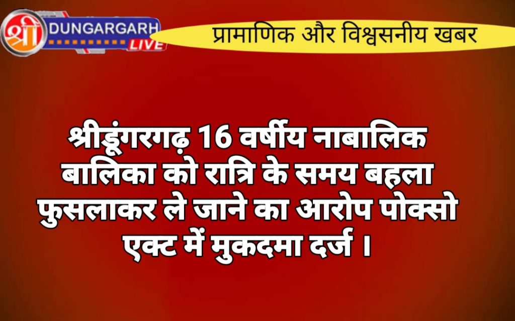 श्रीडूंगरगढ़ थाना क्षेत्र के पुनदलसर गांव से एक नाबालिक बालिका को रात्रि के समय बहला फुसलाकर ले जाने की घटना सामने आई है। बालिका के परिजनो द्वारा श्रीडूंगरगढ़ पुलिस थाने में नागौर जिले के झाड़ेली निवासी एक युवक के खिलाफ नामजद मुकदमा दर्ज करवाया गया है जिसमें बताया गया है की उसकी 16 वर्षीय नाबालिक बेटी को युवक बहला फुसलाकर अपहरण करके शादी करने की नियत से भगाकर ले गया है। पुलिस ने आरोपी के खिलाफ़ पोक्सो एक्ट में मुकदमा दर्ज कर लिया है और मामले की जांच कर रही है।