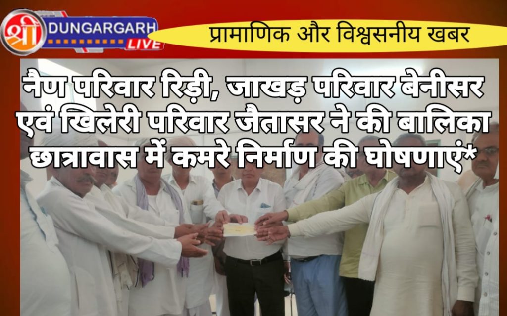 3. स्वर्गीय नथाराम जी , स्व रेवंतराम जी पुत्र स्व जवानाराम जी खिलेरी जैतासर की स्मृति में उनके पुत्रगण आशुराम, भंवरलाल, श्रवणराम, गोपालराम, कालुराम, संतोष कुमार, गिरधारीलाल खिलेरी ने बालिका छात्रावास में कमरा निर्माण की घोषणा की है बैठक में उपस्थित सदस्यों ने दानदाताओं का आभार प्रकट किया । क्रय विक्रय सहकारी समिति के अध्यक्ष तुलछीराम गोदारा, पूर्व सरपंच लक्ष्मणराम खिलेरी, भंवरलाल खिलेरी, कोडाराम भादू, कुम्भाराम गोदारा, प्रभूराम बाना, गणेश पोटलिया, ओमप्रकाश भादू, रामचंद्र गिला, हरिराम सारण, जैसाराम कुलड़िया, सहीराम सायच, हनुमान महिया, चरणसिंह सारण, प्रमोद गोदारा सहित अनेक गणमान्यजन उपस्थित रहे । छात्रावास अधीक्षक श्रवण कुमार भामू ने सभी का आभार प्रकट किया ।