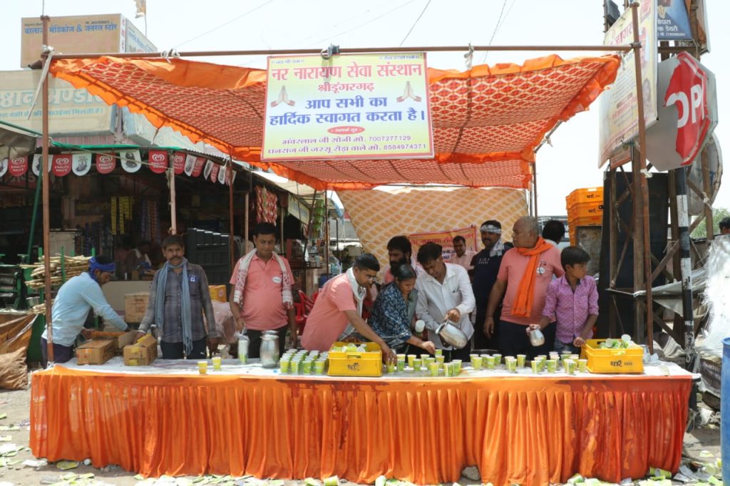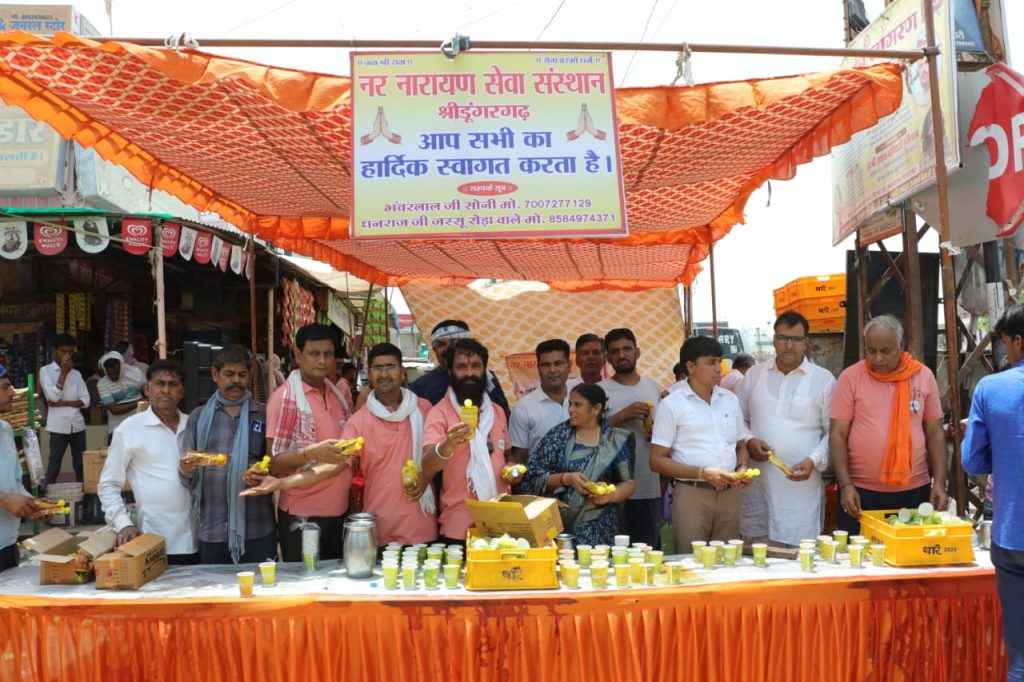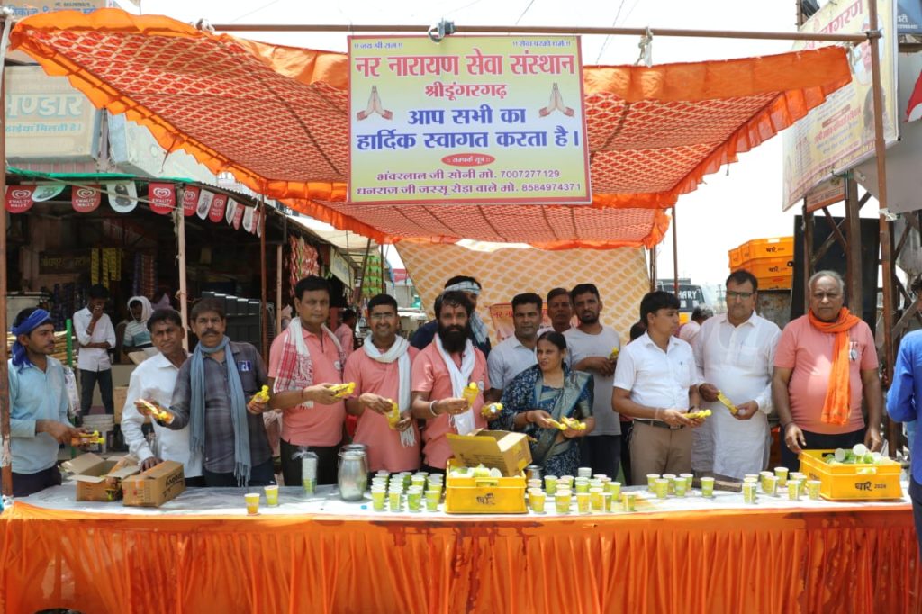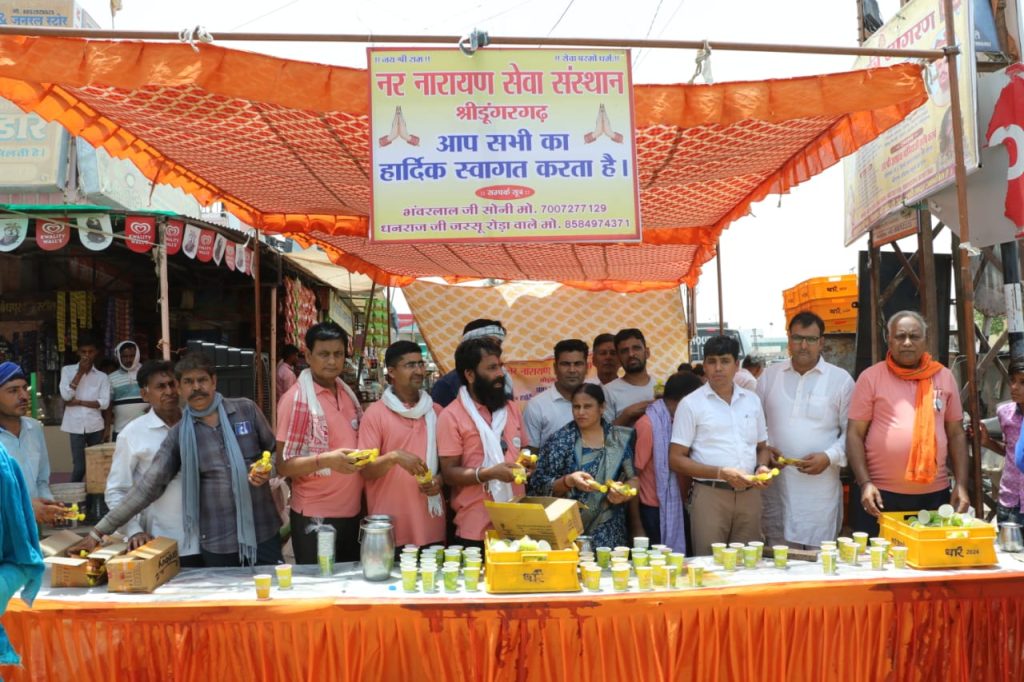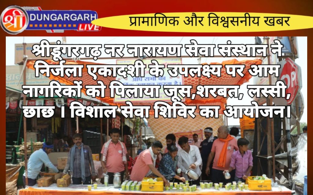 निर्जला एकादशी के उपलक्षय पर नर नारायण सेवा संस्थान श्रीडूंगरगढ़ ने की आम राहगीरों को लस्सी, छाछ, लीची शरबत, रसना शरबत, केरिपाना शरबत, और रोज शरबत का वितरण किया। नर नारायण सेवा संस्थान के जय बाहेती ने बताया कि संस्था के संस्थापक धनराज जी जस्सू ने पिछले वर्ष के भाँती इस वर्ष भी धार्मिक पुण्य कार्य के अंतर्गत निर्जला एकादशी के उपलक्षय पर श्रीडूंगरगढ़ के घूमचकर पर विशाल सेवा शिविर का आयोजन किया। जिसमे में संस्था के सदस्यों ने बढ़ चढ़ के सहयोग किया। संस्थान के सहयोग कर्ताओ के सहयोग से इस विशाल सेवा शिवर में लस्सी, छाछ, लीची शरबत, केरीपन्ना शरबत, रसना शरबत, रोज शरबत का वितरण आम जन मानस के लिए किया गया इस विशाल सेवा पुण्य शिवीर मे उपस्थित रहे संस्थान अध्यक्ष सुषमा श्याम करनानी, श्याम करनानी, आनंद जोशी, भवरलाल सोनी, विनोद तोलम्बीया , पवन स्वामी , कैलाश सारस्वत , नारायण प्रजापत , गोसेवार्थ सुंदरकांड मंडली के सदस्य, मोमासर मित्र मंडली के सदस्य और रतनगढ़ से वकील लछमन प्रजापत , वकील श्रीभगवान सारस्वत नर नारायण सेवा संस्थान टीम और अन्य गणमान्य नागरिक उपस्थित रहे।