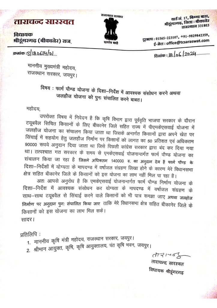 सारस्वत ने पत्र में बताया कि पिछली भाजपा सरकार के समय जिले के किसानों को जलहौज योजना में अनुदान दिया जाता था जिसे पिछली कांग्रेस सरकार द्वारा बंद कर फार्मपॉन्ड योजना संचालित की गई, परंतु उस योजना का लाभ लेने के लिए वर्षा जल संग्रहण की शर्त लगा दी। जिससे क्षेत्र के किसानों को खेतों में फार्मपौंड बनाने पर अनुदान से वंचित होना पड़ा। अब विधायक ने राज्य सरकार को फार्मपोंड योजना के दिशा निर्देश में आवश्यक संशोधन कर वर्षा जल संग्रहण के साथ-साथ ट्यूबवेल द्वारा सिंचित खेतों में भी फॉर्मपौंड पर अनुदान दिलाने हेतु आग्रह किया है । गौरतलब है कि वर्तमान में संचालित फॉर्मपौंड योजना में किसानों को अपने खेत पर फॉर्मपौंड निर्माण करने पर 140000 तक का अनुदान किया जाता है परंतु इसका लाभ केवल कोलायत क्षेत्र के मगरा बेल्ट के कुछ ही किसानो को मिल पाता है। विधायक द्वारा स्थानीय किसानों द्वारा उनको अवगत करवाने पर राज्य सरकार को यह पत्र भेजा है। किसान प्रतिनिधियों ने इस पर प्रसन्नता व्यक्त करते हुए विधायक का आभार जताया।
