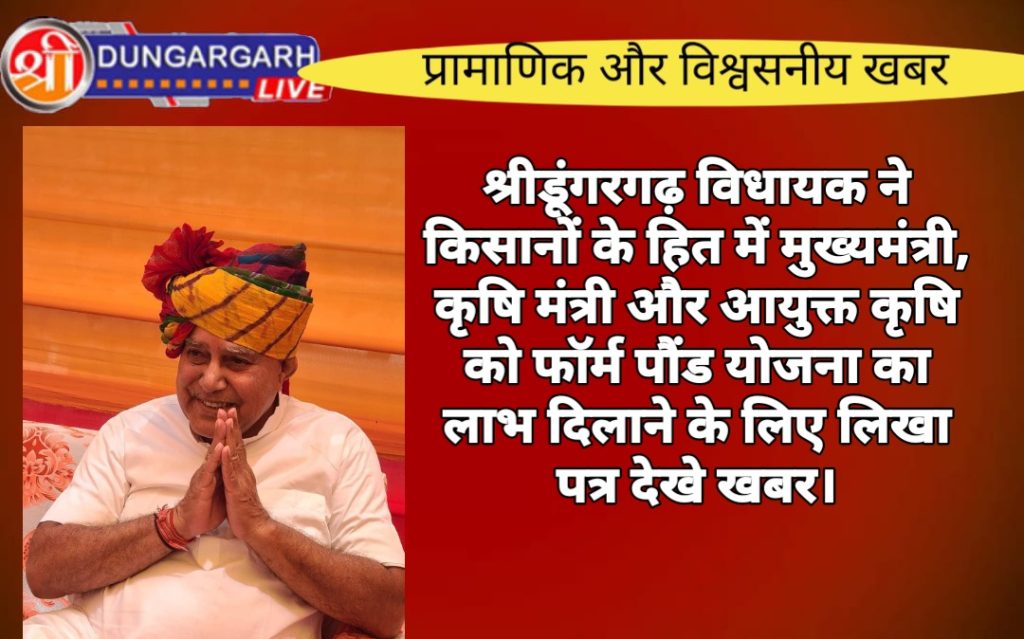 श्रीडूंगरगढ़ विधायक ताराचंद सारस्वत लगातार अपने क्षेत्र के आमजन की बेहतरी तथा सुविधा मुहैया कराने के लिए राज्य सरकार को पत्र लिखकर अवगत करवा रहे हैं । इसी कड़ी में अब उन्होंने क्षेत्र के किसानों के लिए महत्वपूर्ण फॉर्मपॉन्ड योजना का लाभ किसानों को दिलाने के लिए मुख्यमंत्री कृषि मंत्री और आयुक्त कृषि को पत्र लिखा है ।