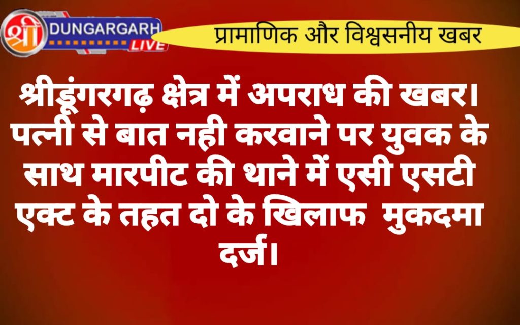 श्रीडूंगरगढ़ थाने में मुकदमा दर्ज करवाते हुए रामचंद्र पुत्र रतनलाल नायक उम्र 22 साल निवासी प्रताप बस्ती श्रीडूंगरगढ़ ने बताया कि शाम के समय में मेरी पत्नी से मोबाइल पर बात कर रहा था तभी आरोपी फतेहसिंह राजपूत और ओमप्रकाश ने मुझे अपनी पत्नी से बात करवाने को कहा ।मैंने मना करने पर मेरे साथ मारपीट की तथा आरोपियों ने मुझे पीटने हुवे पुंदलसर गांव के कच्चे रास्ते पर ले गए वहा पर मारपीट की जिससे मेरे आंख पर चोट लगी है कमर और गर्दन पर चोट लगी पीड़ित ने बताया की वहा पर ताराचंद और राजेश ने मुझे छुड़वाया। आरोपियों के खिलाफ श्रीडूंगरगढ़ थाने में एसी एसटी एक्ट के तहत मुकदमा दर्ज कर लिया है और आगे की जांच सीईओ निकेत पारीक कर रहे है ।