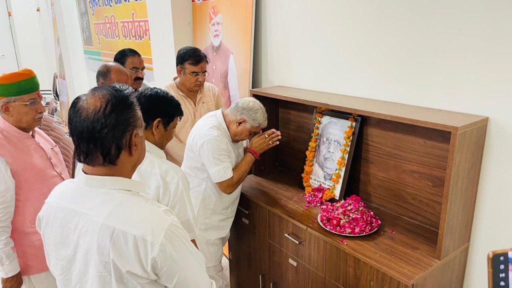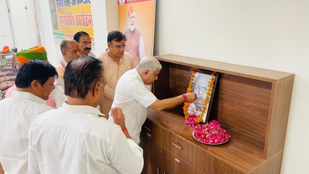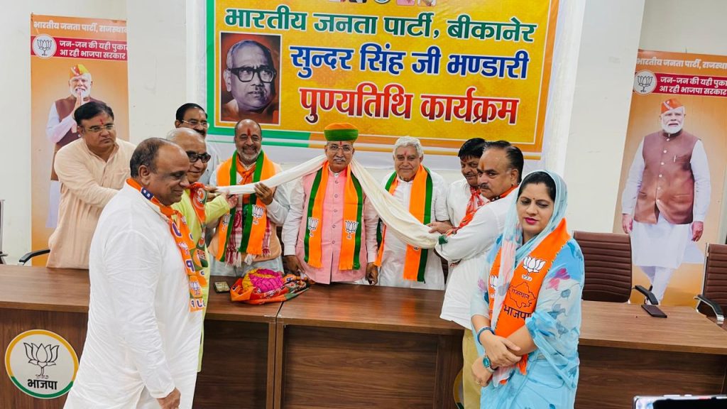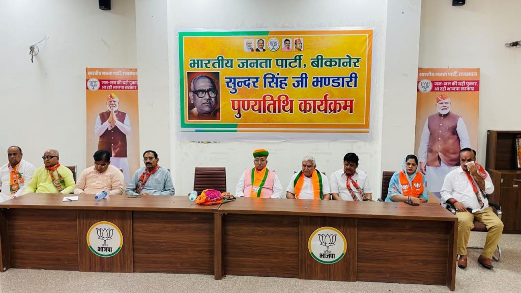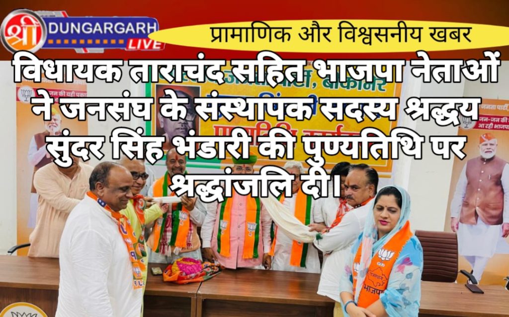 आज भारतीय जनता पार्टी शहर एवं देहात के संयुक्त तत्वाधान में बीकानेर संभाग कार्यालय में आयोजित भारतीय जनता पार्टी के वरिष्ठ नेता व जनसंघ के संस्थापक सदस्य श्रद्धय सुंदर सिंह जी भंडारी की पुण्यतिथि कार्यक्रम में विधायक ताराचंद सारस्वत शामिल हुए। इस अवसर पर विधायक ताराचंद सारस्वत ने श्रद्धय सुंदर सिंह जी भंडारी के चित्र पर श्रद्धासुमन अर्पित कर याद किया। इस अवसर पर सुंदर सिंह जी को याद करते हुए विधायक ताराचंद सारस्वत ने कहा की भारतीय जनता पार्टी के वरिष्ठ नेता एवं जनसंघ के संस्थापक सदस्य श्रद्धय सुंदर सिंह भंडारी जी का संपूर्ण जीवन जनसेवा, संगठन विस्तार और राष्ट्र निर्माण को समर्पित रहा आज उनकी पुण्यतिथि पर उनको कोटिशः नमन करता हूँ। भंडारी जी की सादगी, सहजता और वैचारिक स्पष्टता अनुकरणीय है। वे सदैव हमें प्रेरणा प्रदान करते रहेंगे। इस दौरान भाजपा संभाग कार्यालय पर केंद्रीय मंत्री अर्जुनराम जी मेघवाल के चौथी बार सांसद एवं दूसरी बार के केंद्रीय कानून मंत्री बनने पर पार्टी विधायक ताराचंद सारस्वत सहित भाजपा पदाधिकारियों एवं कार्यकर्ताओं ने भव्य स्वागत किया। इस दौरान मंच पर केंद्रीय मंत्री अर्जनराम मेघवाल,भाजपा शहर जिलाध्यक्ष विजय आचार्य,श्रीडूंगरगढ़ विधायक ताराचंद सारस्वत,बीकानेर पश्चिम विधायक जेठानंद व्यास,नोखा पूर्व विधायक बिहारी लाल बिश्नोई,बीकानेर महापौर सुशीला कंवर,उप महापौर राजेन्द्र पंवार,ओबीसी मोर्चा प्रदेश अध्यक्ष चम्पालाल गेदर,डॉ सत्यप्रकाश आचार्य,मुमताज अली भाटी,शहर जिला महामंत्री मोहन सुराणा विराजमान रहे। इस अवसर नगरपालिका चेयरमैन मानमल शर्मा,मंडल अध्यक्ष महावीर प्रजापत,पार्षद रजत आसोपा,श्याम पारीक,पवन स्वामी,रजनीकान्त सारस्वत,सहित जिला पदाधिकारी ,मण्डलपदाधिकारी सहित भाजपा कार्यकर्ता उपस्थित रहे।