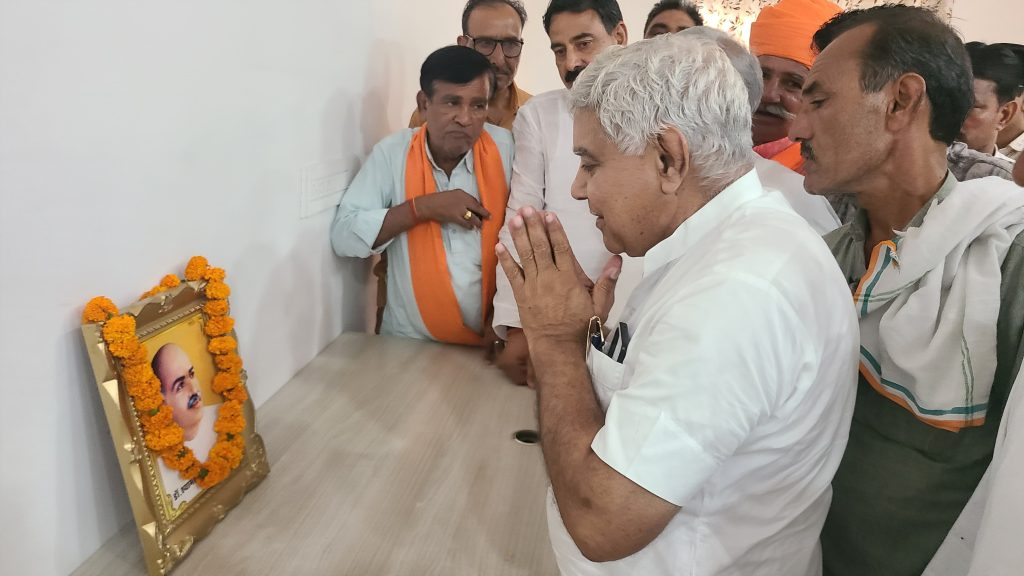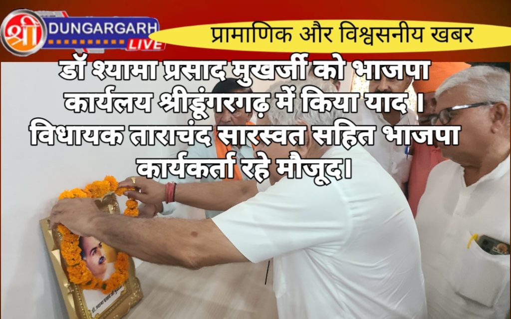आज श्रीडूंगरगढ़ शहर मंडल द्वारा भारतीय जनसंघ के संस्थापक, प्रखर राष्ट्रवादी और देशभक्त, परम श्रद्धय डॉ श्यामा प्रसाद मुखर्जी की पुण्यतिथि भाजपा कार्यालय श्रीडूंगरगढ़ पर शहर मंडल अध्यक्ष महावीर प्रजापत की अध्यक्षता में बलिदान दिवस के रूप में बनाया गया। कार्यक्रम में मुख्यवक्ता श्रीडूंगरगढ़ विधायक ताराचंद सारस्वत रहे। इस अवसर विधायक ताराचंद सारस्वत ने भारतीय जनसंघ के संस्थापक, प्रखर राष्ट्रवादी और देशभक्त, परम श्रद्धय डॉ श्यामा प्रसाद मुखर्जी के चरणारविन्दों में श्रद्धासुमन अर्पित कर उन्हें नमन किया। इस दौरान विधायक ताराचंद सारस्वत ने अपने संबोधन में मुखर्जी जी को याद करते हुए कहा कि देश की एकता को और मजबूत की दिशा में डॉ श्यामा प्रसाद मुखर्जी के अद्वितीय प्रयासों के लिए प्रत्येक भारतीय उनका ऋणी हैं ,ड्रा श्यामा प्रसाद मुखर्जी भारत की प्रगति के लिए कड़ी मेहनत की ओर एक मजबूत तथा समृद्व राष्ट्र का सपना देखा। हम उनके सपनों को पूरा करने के लिए प्रतिबद्ध हैं। उन्होंने भारतीय राजनीति और समाज के विकास में महत्वपूर्ण भूमिका निभाई। उनके द्वारा स्थापित भारतीय जनसंघ ने राष्ट्रवाद और सामाजिक न्याय के सिद्धान्तों को मजबूत किया। उनके विचार और आदर्श आज भी हमे प्रेरित करते हैं। उनके आदर्शों पर चलते हुए हम एक समृद्ध और और सशक्त भारत निर्माण के संकल्पित हैं। इस दौरान मंडल अध्यक्ष महावीर प्रजापत ने कहा भारत की एकता अखंडता के लिए अपना सर्वस्व न्योछावर करने वाले अभिजात देशभक्त व भारतीय जनसंघ के संस्थापक, प्रखर राष्ट्रवादी और देशभक्त, परम श्रद्धेय डॉ. श्यामा प्रसाद मुखर्जी जी के बलिदान दिवस पर उन्हें कोटि कोटि नमन।