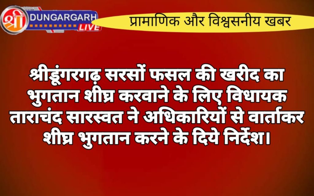 सरकार की ओर से किसानों को उनकी फसल का समर्थन मूल्य पर खरीद की जाती हैं जिसका श्रीडूंगरगढ़ क्षेत्र के किसानों की सरसों की फसल की खरीद के भुगतान न होने की सूचना विधायक ताराचंद सारस्वत को मिलते ही विधायक सारस्वत ने तुरंत संज्ञान लेते हुए किसानों की सरसों की फसल की सरकारी खरीद का भुगतान शीघ्र करवाने के लिए विधायक ताराचंद सारस्वत ने क्षेत्रीय मैनेजर ,डिप्टी रजिस्ट्रार व नेफेड के उच्च अधिकारियों से फोन पर वार्ता कर भुगतान में हो रही देरी की पूरी जानकारी हासिल की। विधायक सारस्वत को नेफेड के अधिकारियों ने बताया कि कुल 830 किसानों की सरसों की खरीद की गई जिसमे 808 किसानों के खरीद का अनुमोदन (अप्रुअल) हो गया शेष 22 किसानों का अनुमोदन होना बाकी हैं। किसानों से कुल 36543 बैग जिसमे एक बैग का वजन 50 किलो होता हैं की खरीद हुई जिसमे 36025 बैग का WR मिल गया और शेष 518 बैग का WR मिलना बाकी हैं जो की कल भेज दिया जाएगा। जबकि क्षेत्रीय मैनेजर का कहना है कि 2193 बैग का WR आना बाकी बताया जिससे विधायक ने नाराजगी जाहिर करते हुए कहा कि वेयर हाउस में बैग को पहुंचाने में हो रही देरी व किसानों की फसल खरीद के भुगतान में हो रही देरी से किसानों को परेशानी का सामना करना पड़ रहा है जिसे बर्दास्त नही किया जाएगा। विधायक ने अधिकारियों को इस घोर लापरवाही का सुधार कर तुरंत WR नेफेड को भेजकर किसानों की फसल का भुगतान शीघ्र करने के निर्देश दिए। विधायक ताराचंद सारस्वत को अधिकारियों ने बताया कि 70 किसानों का 56 लाख का भुगतान कल तक हो जाएगा। शेष किसानों का बकाया भुगतान अति शीघ्र ही करवा दिया जायेगा।