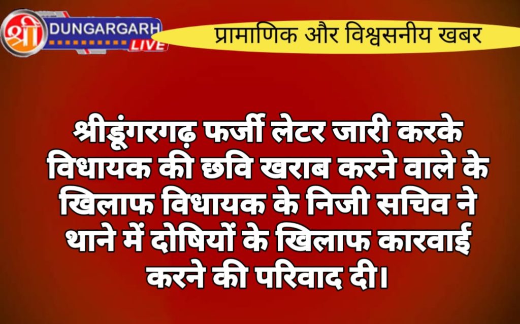 श्री डूंगरगढ़ पिछले पांच छह दिनों से सोशल मीडिया पर विधायक के नाम से एक फर्जी लेटर वायरल हो रहा है जिसमें विधायक के जाती वाद करने का आरोप लग रहा है हालाकि विधायक ने बताया की ये लेटर फर्जी है आज श्रीडूंगरगढ़ थाने में विधायक के निजी सचिव रजनीकांत द्वारा थाना अधिकारी इंद्र कुमार को एक परिवाद दिया गया। निजी सचिव ने आरोप लगाया है कि विधायक की छवि को खराब करने के लिए एक फर्जी डिजायर लेटर वायरल किया गया जिसमें विधायक का कोई लेना-देना नहीं है और इसमें जो भी आरोपी हैं उनके खिलाफ पुलिस कड़ी से कड़ी कार्रवाई करें। अब पुलिस द्वारा इसमें पूरा अनुसंधान किया जाएगा और उम्मीद है कि जल्द ही इस पूरे मामले का खुलासा होगा।