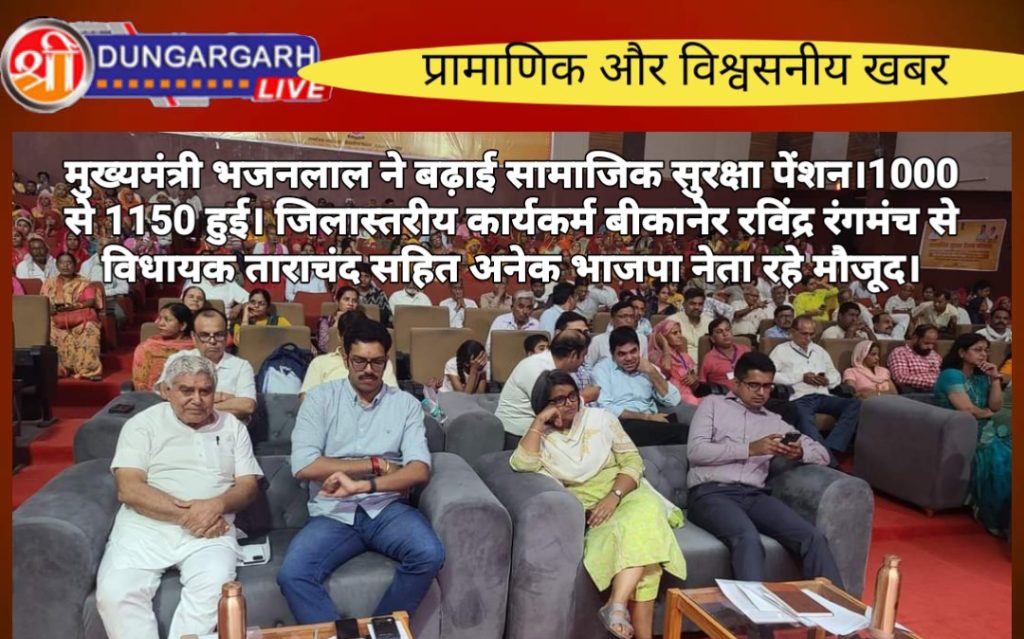 बीकानेर जिला स्तरीय कार्यकर्म रविंद्र रंगमंच से श्रीडूंगरगढ़ विधायक ताराचंद सारस्वत, महापौर सुशीला कंवर राजपुरोहित, डॉ. सत्यप्रकाश आचार्य,रामगोपाल सुधार और विजय आचार्य विचार व्यक्त किए और केंद्र एवं राज्य सरकार की विभिन्न योजनाओं के बारे में बताया। वक्ताओं ने बताया कि मुख्यमंत्री की संवेदनशील पहल से सामाजिक सुरक्षा पेंशन योजना के तहत 1 अप्रैल से एक हजार रुपए से बढ़ाकर 1150 रुपए प्रति पेंशनर प्रति माह बढ़ी हुई पेंशन राशि दी जाएगी। इस दौरान कोलायत विधायक अंशुमान सिंह भाटी, जिला कलेक्टर नम्रता वृष्णि, जिला परिषद के मुख्य कार्यकारी अधिकारी सोहन लाल, उप महापौर राजेंद्र पंवार, ओम सोनगरा, मोहन सुराणा, श्याम सुंदर चौधरी, नरेश नायक, अशोक प्रजापत, कमल आचार्य, हनुमान सिंह चावड़ा, विनोद कोरल, भारती अरोड़ा, देवी लाल मेघवाल, कुंभनाथ सिद्ध, हनुमान चावड़ा, चंद्र मोहन जोशी, अशोक प्रजापत, सीआर चौधरी, गोपाल कूकना, न्याय एवं अधिकारिता विभाग के सहायक डॉ. अरविंद अचार्य, सुरेंद्र कुमार सहित बड़ी संख्या में लाभार्थी, जनप्रतिनिधि और अधिकारी उपस्थित रहे। कार्यक्रम का संचालन संजय पुरोहित ने किया ।