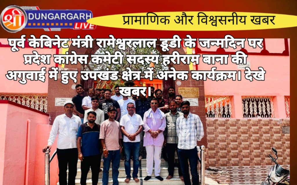 किसान केसरी व पूर्व कैबिनेट मंत्री रामेश्वरलाल डूडी के जन्मदिन पर प्रदेश कांग्रेस कमेटी सदस्य हरीराम बाना की अगुवाई में हुए उपखंड क्षेत्र में अनेक कार्यक्रम हुए है। बाना के साथ बड़ी संख्या में कांग्रेस कार्यकर्ता हनुमान धोरा मंदिर पहुंचे और यहां हनुमान बाहुक का पाठ कर अपने नेता के उत्तम स्वास्थ्य की कामना की। इसके दौरान युवाओं ने श्रमदान करते हुए मंदिर परिसर में अशोक के पौधे लगाए। मंदिर के नीचे ही स्थित गौशाला में युवाओं ने गौवंश को गुड़ खिलाया। बाना ने डूडी के नेतृत्व व उनके व्यक्तित्व के बारे में कार्यकर्ताओं से चर्चा की। युवा कांग्रेस विधानसभा अध्यक्ष संतोष गोदारा ने बताया की विधानसभा क्षेत्र के विभिन्न गावो में किसान नेता का जन्मदिन पौधारोपण व गौसेवा कर मनाया गया है। इस दौरान विमल भाटी, विक्रम सिंह कोटडिया, महेश पिलानिया, मोसिन खान, ओमप्रकाश जाखड़, विजयपाल जाखड़, किशन मलघट, ओमप्रकाश बाना, कैलाश गुरावा, मुकुल माली, देवीलाल, दिनेश शर्मा, किशन नाई, सुरेश बाना, धनु खान, विक्की प्रजापत, राहुल वाल्मीकि, मुरली सिखवाल, दिलीप धोबी, कपिल शर्मा, भरत व्यास, सुभाष गोदारा, मोडाराम बुडीया, शुभम शर्मा आदि युवा सक्रिय रहें व डूडी को शुभकामनाए दी।