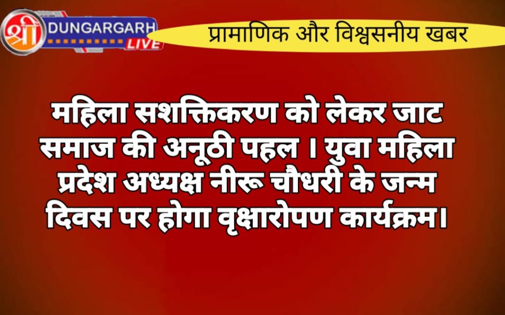 महिला सशक्तिकरण को लेकर के जाट समाज की अनूठी पहल । युवा महिला प्रदेश अध्यक्ष नीरू चौधरी ( निरमा) के जन्मदिवस के अवसर पर वृक्षारोपण का कार्यक्रम महर्षि दयानंद सरस्वती छात्रावास श्रीडूंगरगढ़ में रखा गया है । छात्रावास मैनेजमेंट कमेठी के अध्यक्ष एडवोकेट श्याम सुंदर आर्य एवं छात्रावास अधीक्षक श्रवण कुमार भाम्भू ने बताया कि समाज में बालिकाओं एवं महिला शक्ति को प्रोत्साहित करने के लिए समाज की बेटी नीरू चौधरी से इनके जन्मदिन के अवसर पर श्रीडूंगरगढ़ छात्रावास में 5 जुलाई को वृक्षारोपण करवा कर समाज में अच्छा संदेश पहुंचाएंगे । इसमें नीरू चौधरी का कहना है कि मुझे गर्व है मेरा समाज जो हमेशा बालिकाओं को आगे बढ़ाने में तत्पर रहता है । मै भी समाज की बहन बेटियों के लिए हमेशा आगे बढ़ाने को तैयार मिलूंगी । संस्था के मंत्री सुशील सेरडिया ने बताया कि 5 जुलाई को छात्रावास परिसर में मेगा वृक्षारोपण कार्यक्रम रखा गया है जिसमें महिला शक्ति एवं गणमान्य लोगों की भागीदारी रहे।