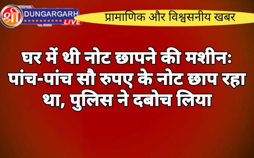 लूनकरनसर में पुलिस ने पांच-पांच सौ रुपए के नकली नोट की गड्डियां बरामद की है। ये नोट एक घर में छापे जा रहे थे। पुलिस को भनक लगी तो घर पर छापा मारकर नकली नोट बरामद कर लिए। नोट छापने की मशीन भी जब्त की गई है।