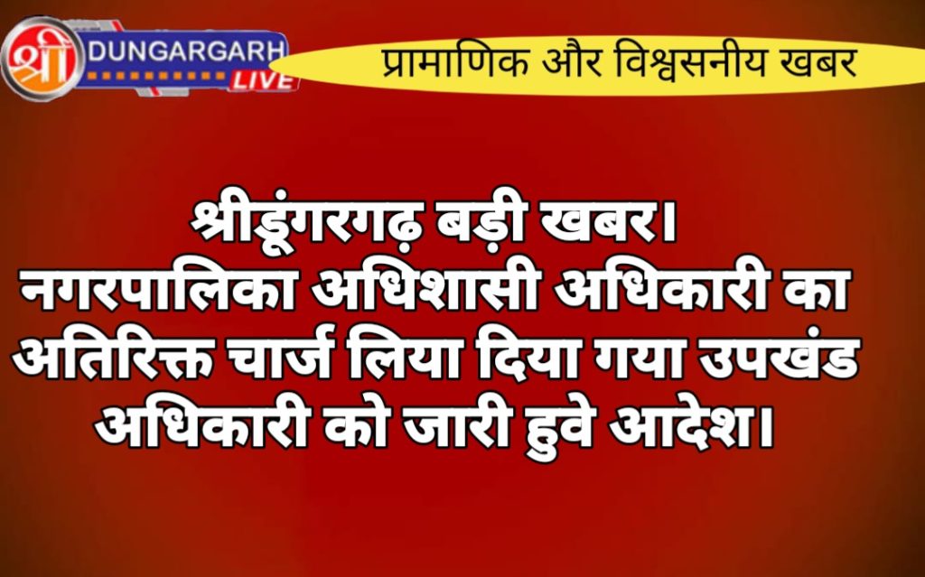 श्रीडूंगरगढ़ नगरपालिका के अधिशासी के रिक्त पद पर अब श्रीडूंगरगढ़ उपखंड अधिकारी को अतिरिक्त कार्यभार सोपा गया है। स्वायत शासन विभाग के निदेशक संयुक्त सचिव सुरेश कुमार ओला द्वारा इसके आदेश जारी किए गए हैं। अब उपखंड अधिकारी श्रीमती उमा मित्तल एसडीएम के अलावा श्रीडूंगरगढ़ नगर पालिका का अतिरिक्त प्रभार भी देखेगी।