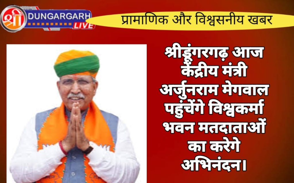 भाजपा केंद्रीय मंत्री अर्जुनराम मेगवाल आज जीत के बाद पहली बार श्रीडूंगरगढ़ आ रहे है विश्वकर्मा मन्दिर में सुबह 11 बजे राष्ट्रीय कार्यक्रम मतदाता अभिनन्दन एवं विजय संकल्प यात्रा कार्यक्रम के तहत मतदाताओं का अभिनंदन करके कार्यक्रम मनाएंगे भाजपा कार्यकर्तागण। इस दौरान कानून मंत्री अर्जुनराम जी मेघवाल , श्रीडूंगरगढ़ विधायक ताराचंद सारस्वत, विश्वकर्मा कल्याण बोर्ड अध्यक्ष रामगोपाल सुथार सहित पार्टी के पदाधिकारीगण, कार्यकर्तागण मौजूद रहेंगे । कार्यक्रम संयोजक एवं विधानसभा संयोजक लीलाधर बोथरा ने जानकारी देते हुए बताया कि इस कार्यक्रम में विधानसभा क्षेत्र के सभी कार्यकर्तागण शामिल होंगे । कार्यकर्ताओं में जबरदस्त उत्साह है मंत्री जी को तीसरी बार जीत दर्ज की है।अभी से कार्यकर्ता विश्वकर्मा भवन पहुंचने चालू हो गए है।