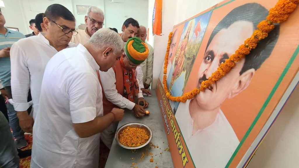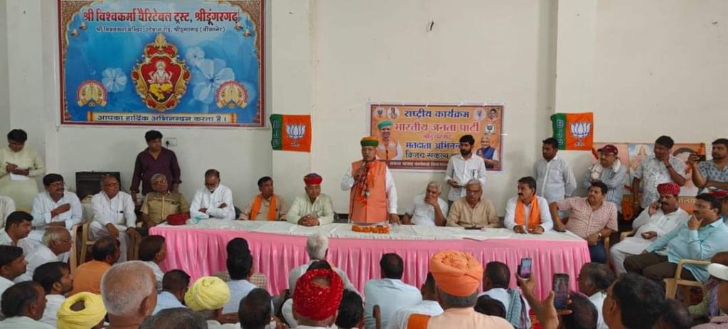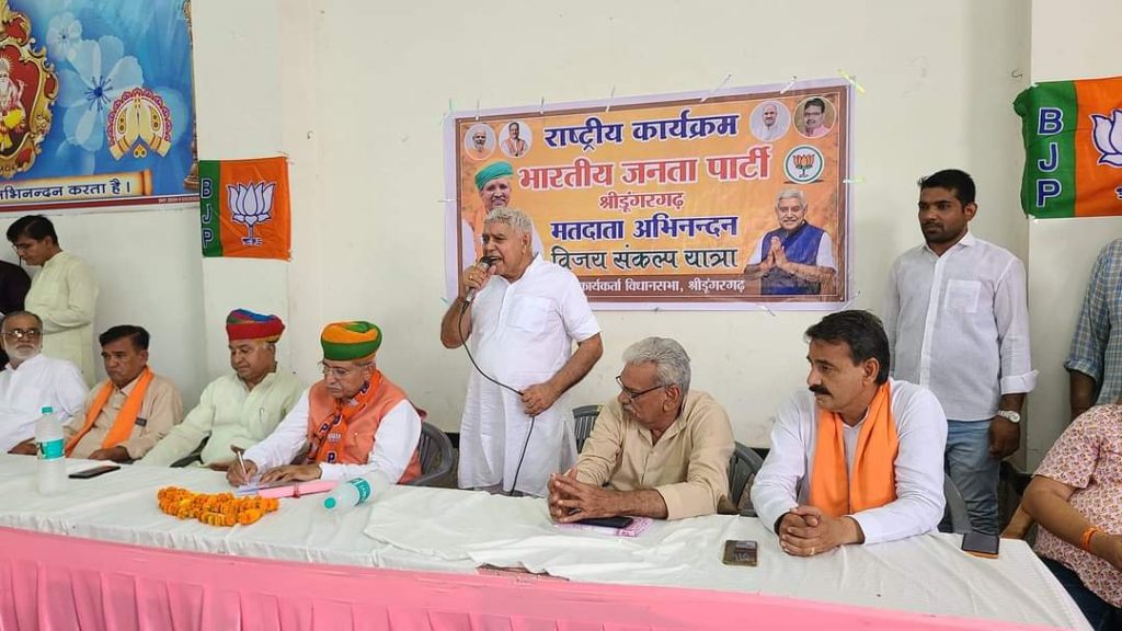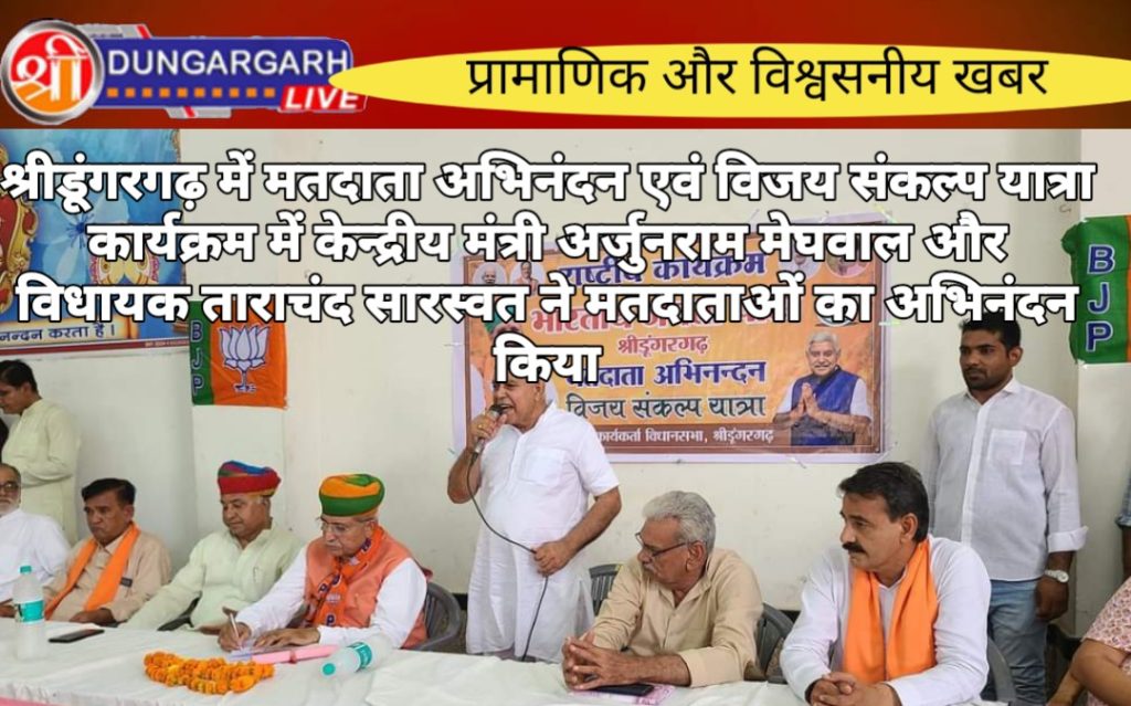 भारतीय जनता पार्टी श्रीडूंगरगढ़ द्वारा आयोजित राष्ट्रीय कार्यक्रम मतदाता अभिनंदन एवं विजय संकल्प यात्रा कार्यक्रम में केंद्रीय कानून मंत्री भारत सरकार श्री अर्जुनराम मेघवाल और विधायक ताराचंद सारस्वत ने द्वीप प्रज्वलन के साथ कार्यक्रम की शुरुवात की । कार्यक्रम में पधारे केंद्रीय मंत्री अर्जुनराम मेघवाल का विधायक ताराचंद सारस्वत ने साफा और शॉल के साथ किया । केंद्रीय कानून मंत्री अर्जुनराम मेघवाल ने संबोधन करते हुए सभी मतदाताओं का आभार जताया तथा देश के यशस्वी प्रधानमंत्री नरेन्द्र मोदी जी के नेतृत्व में आगामी होने वाले करोड़ों के रूपये के विकास कार्यों के बारे में बताया जिसमें निश्चित रूप से श्री डूंगरगढ़ क्षेत्र में भी होने वाले बड़े विकास कार्यों एवं योजनाओं के बारे में बताया । विधायक ताराचंद सारस्वत ने केंद्रीय मंत्री को बधाई देते हुए क्षेत्र के पार्टी कार्यकर्ताओं एवं मतदाताओं का आभार जताया तथा मजबूती से कड़ी धूप में पार्टी के लिए समर्पित भाव से कार्य करने वाले कार्यकर्ताओं का ह्रदय से आभार जताते हुए धन्यवाद ज्ञापित किया। कार्यक्रम संयोजक लीलाधर बोथरा ने सफल कार्यक्रम के लिए सभी का आभार व्यक्त किया । इस दौरान कार्यक्रम में उपस्थित ओबीसी प्रदेश उपाध्यक्ष महावीर चारण,महापौर प्रतिनिधि गुमानाराम राजपुरोहित,चेयरमैन मानमल शर्मा, लोकसभा संयोजक सत्यप्रकाश आचार्य,किसान मोर्चा जिलाध्यक्ष भंवरलाल जांगिड़,ओबीसी मोर्चा जिलाध्यक्ष विनोद गिरी गुंसाई,दीपक पारीक,पूर्व चेयरमैन रामेश्वरलाल पारीक,जिला उपाध्यक्ष शिव स्वामी,कुंभाराम सिद्ध,पूर्व प्रधान छेलूसिंह शेखावत ने भी संबोधन किया। इस दौरान मौजूद रहे तोलाराम मारू किसन गोदारा,बजरंगलाल सारस्वत,रामनिवास महिया,मंडल अध्यक्ष महावीर प्रजापत,गिरधारीलाल गोदारा,शिव जोशी,सरपंच सत्यनारायण सारस्वत, भंवरसिंह झंझेऊ, जुगराज संचेती,रणवीर सिंह,पवन पारीक ,जिला परिषद सदस्य सुभाष कमलिया,हेमनाथ जाखड़,पंचायत समिति सदस्य मोहन कुलडिया, भिन्यानाथ सिद्ध,पोकरनाथ जाखड़,महामंत्री जगदीश पारीक,मोहननाथ सिद्ध,महेश राजोतिया,सुरेंद्र चुरा,मूलाराम मेघवाल, एस कुमार,संजय शर्मा,पार्षद जगदीश गुर्जर,रामसिंह जागीरदार,विक्रम सिंह, भरत सुथार,रजत आसोपा,गोपाल छापोला,वेदप्रकाश शर्मा,रतन सिंह सरपंच,समुंदर सिंह सरपंच भागुनाथ सिद्ध, किसन नाथ बलिहारा,मोहन सिंह राजपुरोहित, चांद बारूपाल,थानमल भाटी,रामनिवास बिश्नोई,शुभकरण बिश्नोई,विक्रम सिंह ,मूलचंद इंदोरिया,मदन मेघवाल, मूलनाथ सिद्ध सहित बड़ी संख्या में शहर एवं ग्रामीण क्षेत्र से पधारे श्रीडूंगरगढ़ विधानसभा क्षेत्र के भाजपा पदाधिकारी, पार्टी कार्यकर्ता,वर्तमान एवं पूर्व जनप्र