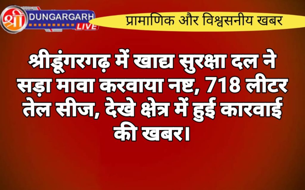 आमजन को शुद्ध एवं पौष्टिक खाद्य पदार्थ उपलब्ध करवाने के उद्देश्य से “शुद्ध आहार मिलावट पर वार” अभियान के तहत खाद्य सुरक्षा अधिकारियों ने श्रीडूंगरगढ़ के मुख्य बाजार में कार्रवाई की गई। सीएमएचओ डॉ. राजेश गुप्ता ने बताया कि मारुति ट्रेडिंग कंपनी के परिसर में मौजूद नेताजी ब्रांड का रिफाइंड सनफ्लावर तेल 15 लीटर वजनी 48 पीपों में रखा था। इस तेल में मिलावट का संदेह होने पर नमूना लेकर बचे हुए लगभग 718 लीटर तेल को मौके पर ही सीज कर दिया गया। अगली कार्रवाई जाखड़ कोल्ड स्टोर पर की गई। पीपों में रखा सड़ा व बदबूदार फंगस लगा भग दो क्विंटल मावा नष्ट करवाया गया। कार्रवाई के दौरान तेल, घी और मावे के नमूने लिए गए जिन्हें जांच हेतु जन स्वास्थ्य प्रयोगशाला भिजवाया कार्रवाई में खाद्य सुरक्षा अधिकारी सुरेंद्र कुम्पर कश गोदारा शामिल रहे। ↑