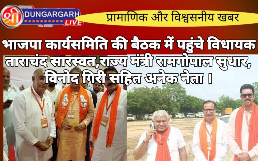 आज भारतीय जनता पार्टी की व्रहद प्रदेश कार्य समिति कि मिटीग जयपुर में रखी गई जिसमें मुख्यमंत्री भजनलाल ,प्रदेश अध्यक्ष सीपी जोशी, केंद्र के मंत्री अर्जुन राम मेगवाल, केंद्रीय मंत्री गजेंद्र सिंह शेखावत सहित बड़े नेता मौजूद रहे। नरेन्द्र मोदी के तीसरी बार प्रधानमंत्री बनने पर अभिनंदन प्रस्ताव पारित किया गया। बैठक में उपस्थित प्रदेश भर से आए संगठन पदाधिकारियों का मुख्यमंत्री भजनलाल शर्मा सहित वरिष्ठ पार्टी पदाधिकारियों ने सकारात्मक मार्गदर्शन किया। बैठक में भाजपा राष्ट्रीय महामंत्री दुष्यंत कुमार गौतम, प्रदेश प्रभारी विनय सहस्त्रबुद्धे, प्रदेश सह- प्रभारी विजया राहटकर, प्रदेश अध्यक्ष डॉ. सीपी जोशी, केन्द्रीय चुनाव समिति सदस्य ओम माथुर, केन्द्रीय मंत्री शिवराज सिंह चौहान, केन्द्रीय मंत्री भूपेन्द्र यादव, केन्द्रीय मंत्री गजेन्द्रसिंह शेखावत, राष्ट्रीय उपाध्यक्ष वसुंधराराजे सिंधिया, केन्द्रीय राज्यमंत्री (स्वतंत्र प्रभार) अर्जुनराम मेघवाल, केन्द्रीय राज्य मंत्री भागीरथ चौधरी, राष्ट्रीय मंत्री अल्का गुर्जर, पूर्व प्रदेशाध्यक्ष अरूण चतुर्वेदी, पूर्व प्रदेशाध्यक्ष अशोक परनामी, पूर्व प्रदेशाध्यक्ष व हरियाणा प्रदेश प्रभारी डॉ. सतीश पूनिया सहित संगठन के वरिष्ठ पदाधिकारीगण व जनप्रतिनिधिगण उपस्थित रहे इस दौरान श्रीडूंगरगढ़ विधायक सारस्वत के साथ कोलायत विधायक भाटी व राज्य मंत्री रामगोपाल सुधार जिला उपाध्यक्ष कुंभाराम सिद्ध ,विनोद गिरी सहित नेता मौजूद रहे