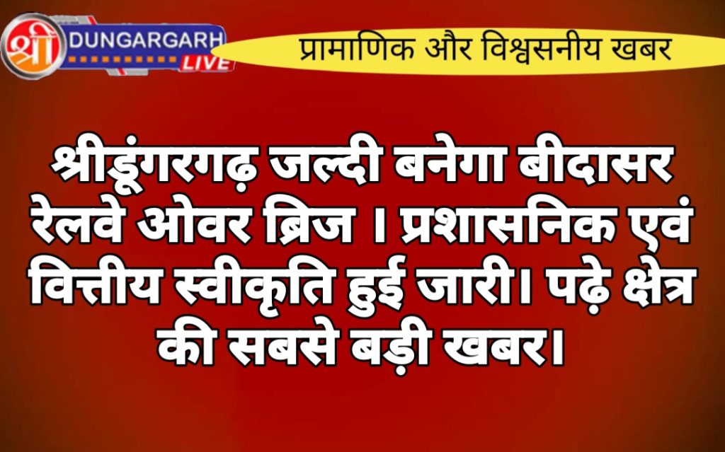 राजस्थान की भाजपा सरकार ने बजट में श्रीडूंगरगढ़ को बहुत सी सौगाते दी थी जिसके लिए क्षेत्र के निवासियों ने विधायक ताराचंद सारस्वत का आभार व्यक्त किया जिनके प्रयासों से राज्य के बजट में पहली बार श्रीडूंगरगढ़ को एक साथ इतना बड़ा बजट मिला है . विधायक ताराचंद सारस्वत ने इसके लिए मुख्यमंत्री भजनलाल जी और उप मुख़्यमंत्री दीया कुमारी जी को धन्यवाद दिया है अभी बजट पेश हुवे तीन दिन ही हुवे है और सारस्वत इन घोषणाओं को अमलीजामा पर पहुंचाने के लिए प्रयासरत हो गए है इसी क्रम में बजट में घोषित श्री डूंगरगढ़ बीदासर रोड ( S H 93) रेलवे ओवर ब्रिज ROB के लिए 44.32 करोड़ की प्रसाशनिक एवं वित्तीय स्वीकृति आज जारी हो गई है . विधायक सारस्वत ने बताया कि बाकी घोषणाओं के लिए भी जल्दी ही प्रशासनिक स्वीकृतिया दिलवाने का प्रयास करेंगे ।