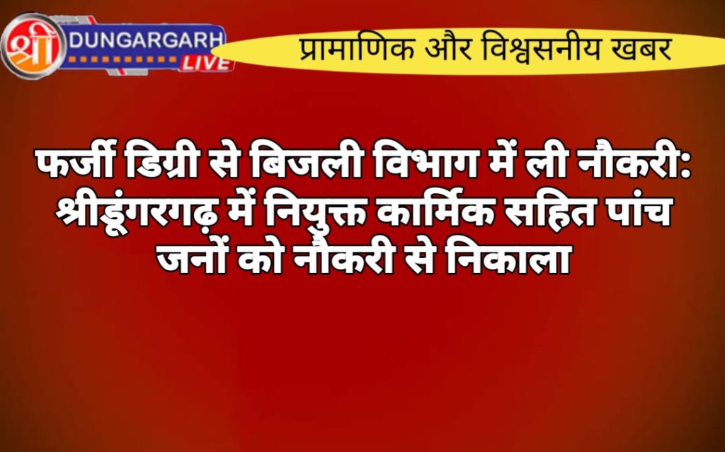 जोधपुर विद्युत वितरण निगम में तकनीकी कर्मचारी के पद पर फर्जी डिग्री से नौकरी करने वाले पांच कर्मचारियों को बर्खास्त कर दिया गया। श्रीडूंगरगढ़ में नियुक्त कार्मिक सहित पांच जनों ने फर्जीवाड़ा किया। अब निगम ने सख्त कार्रवाई का फैसला लिया है।निगम में तकनीशियन-द्वितीय के पद पर फर्जी आईटीआई की डिग्री से नौकरी लेने वाले इन पांचों की अब ना केवल नौकरी जाएगी वरन इनके खिलाफ एफआईआर भी दर्ज करवाने का फैसला लिया गया है।