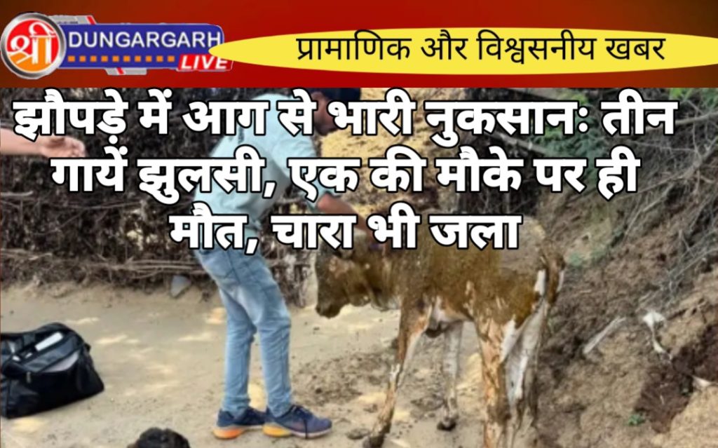 श्रीडूंगरगढ़ के बेनीसर गांव में झौपड़े में आग लगने से एक गाय की दर्दनाक मौत हो गई, जबकि दो अन्य झुलस गई। किसान के खेत में हुए इस हादसे में बड़ी मात्रा में रखा गायों का चारा भी जलकर राख हो गया। घटना के बाद आग पर काबू पा लिया गया, लेकिन तब तक नुकसान काफी हो चुका था।